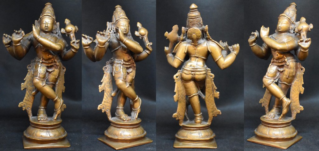 Some of the tell-tale signs of this being a fake include a casting defect in the rear right-hand palm, ill-defined flames of the conch shell, poor casting of his sacred thread (back view) and lifeless working of the left leg toes. Some of these are the result of hurried editing of the wax model and that is what happens when many copies are made in a short time.