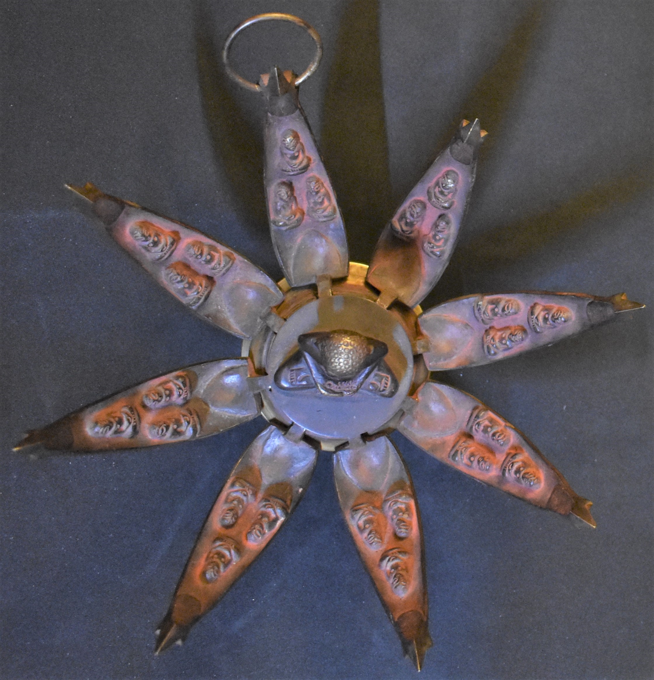 This is Jain lotus mandala. According to some authors, it is used as a travelling shrine. The hinged eight petals, each hosting three Tirthankara’s, when closed forms a lotus bud. The ring, you see on one of the petals, holds the petals in place in the closed position. The central part has a Jina in the meditative position. This is from the Digambara, sky-clad, sect of Jainism.