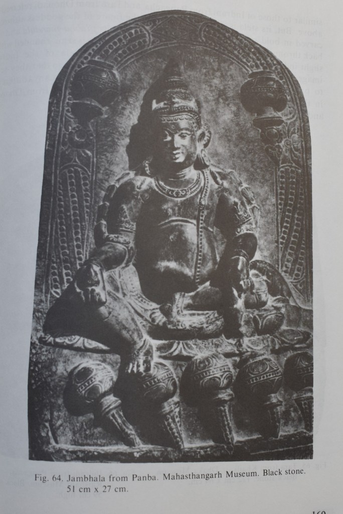 Jambala’s left hand is holding a mongoose (not discernable) which is spewing jewels (noticeable). The right hand is holding a citron. The right foot appears to be resting on an upturned vessel, a jewel casket. Jambala’s scriptural description (Dyana Slokha) is ‘ golden hue, big-bellied, with a citron in the right hand and she-mongoose on the left hand’.