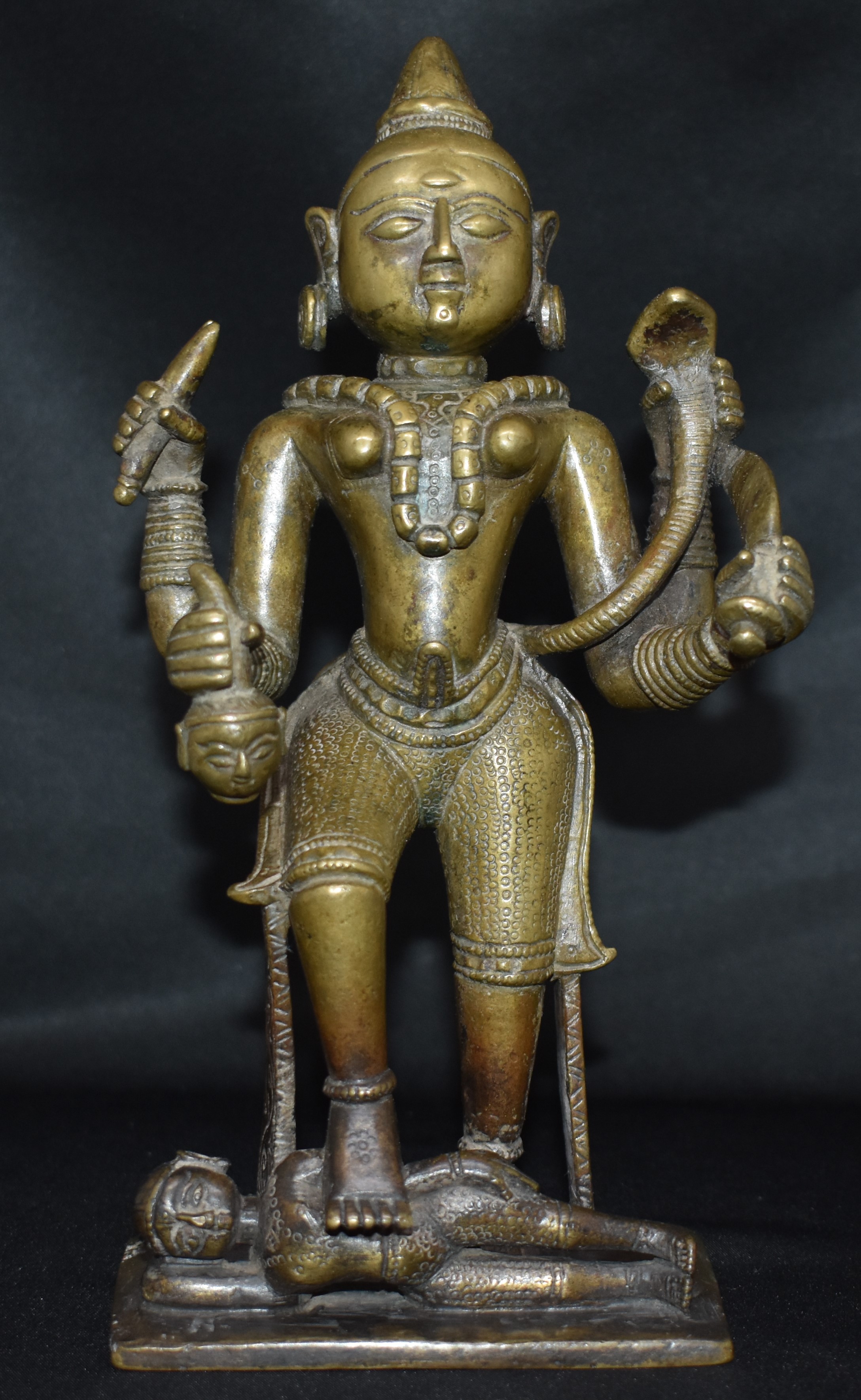 A robust bronze of the Mother Goddess Kali. She is holding in her hands a severed head, an axe, a serpent and a sword. Clockwise, starting from her lower right hand.