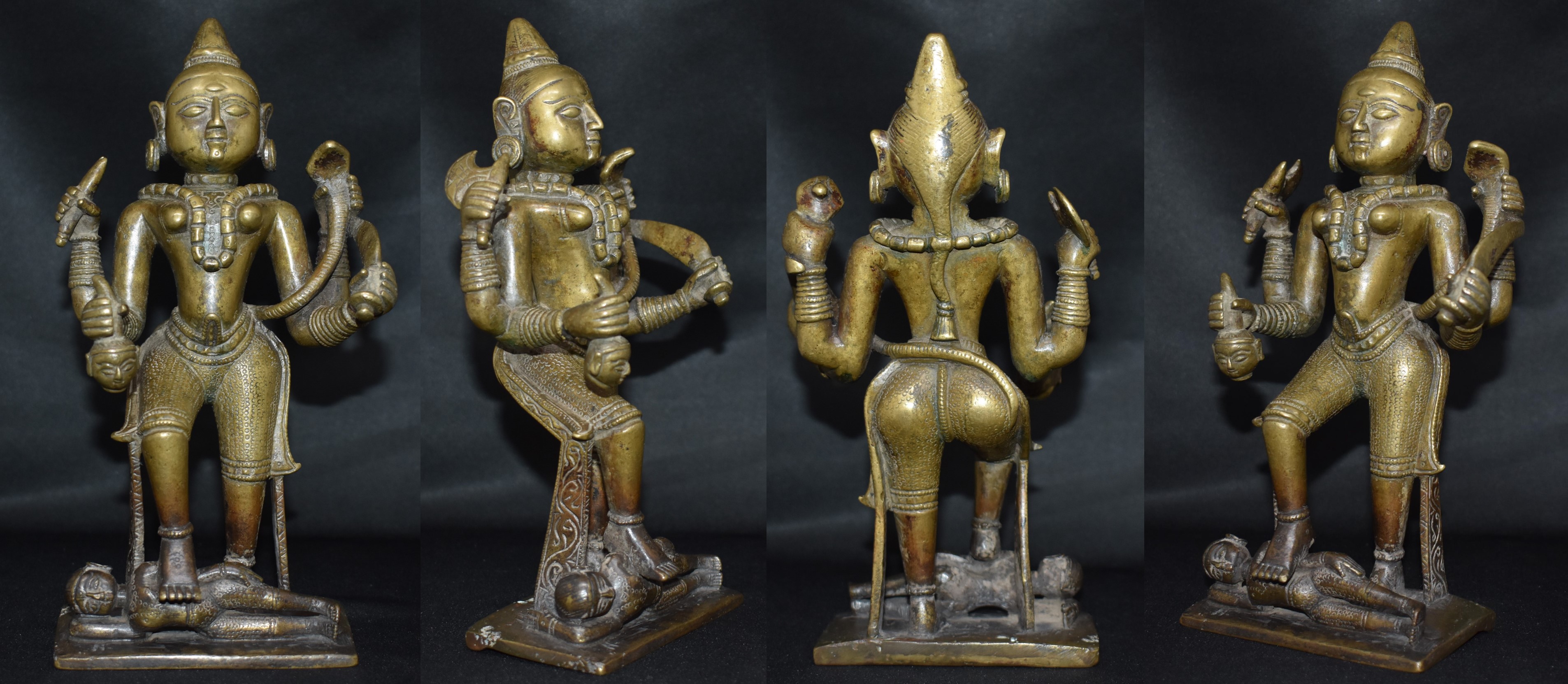 Kali’s forms, based on the attributes, are several. In the book Devi The Great Goddess: Female divinity in South Asian Art Published by Arthur M Sackler Gallery, there are at least seven paintings of Bhadrakali. All with different attributes and their own Dhyana Slokas but with a corpse/human under her. It is quite likely this bronze is also a form of Bhadrakali, though none of the seven forms in that book matches this Vigraha.
