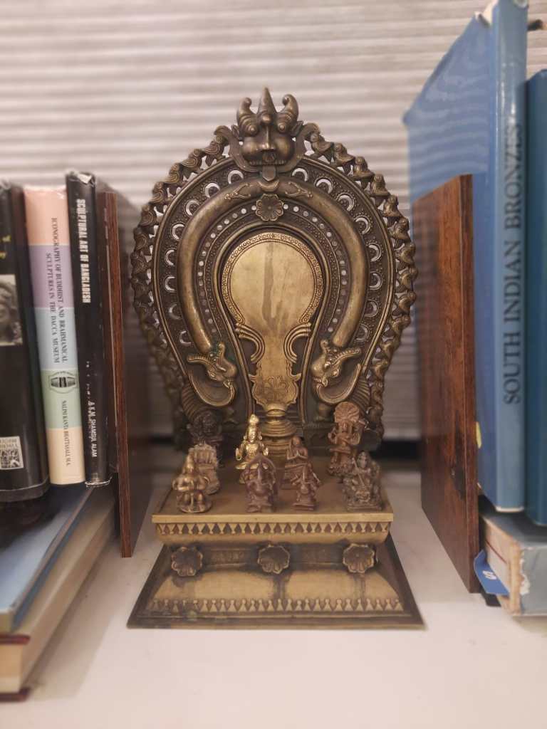 This Kannadi Bimbam with me is modern, and it is a work of art. I first saw Kannadi Bimbam in an article in The Hindu, a newspaper, about fifteen years ago. The idea appealed to me. Since then, I have been looking for one. A dealer from Kerala arranged this for me. It is a new 21st-century item, and it is the most recent bronze in my collection. That does not stop me from giving it the central position on my work desk. See the photo below.