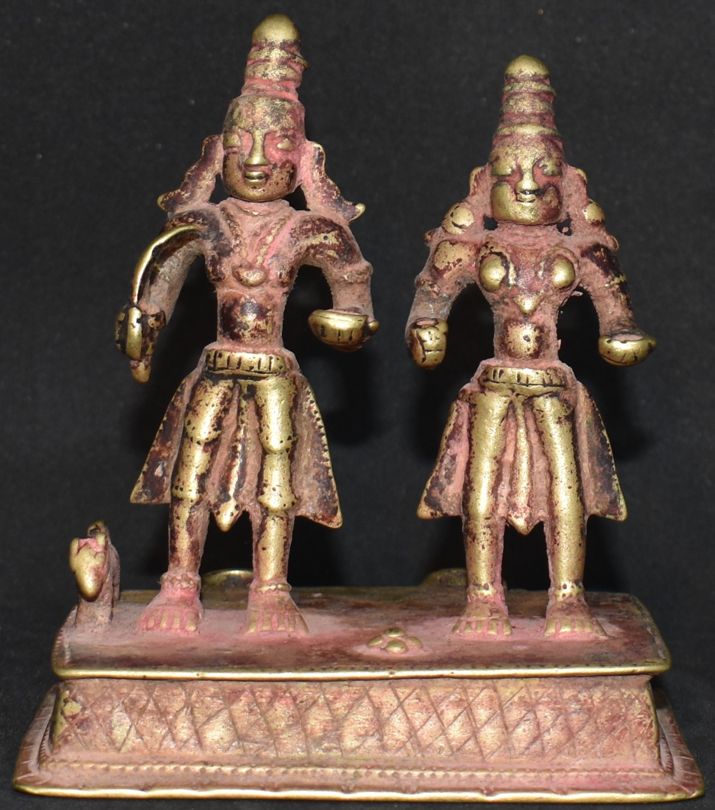 This is Khandobha and his consort Mahalsa. The identification is based on the dog to Khandobha’s right. Khandobha’s worship is prevalent in parts of Maharashtra, Karnataka and Andhra.
