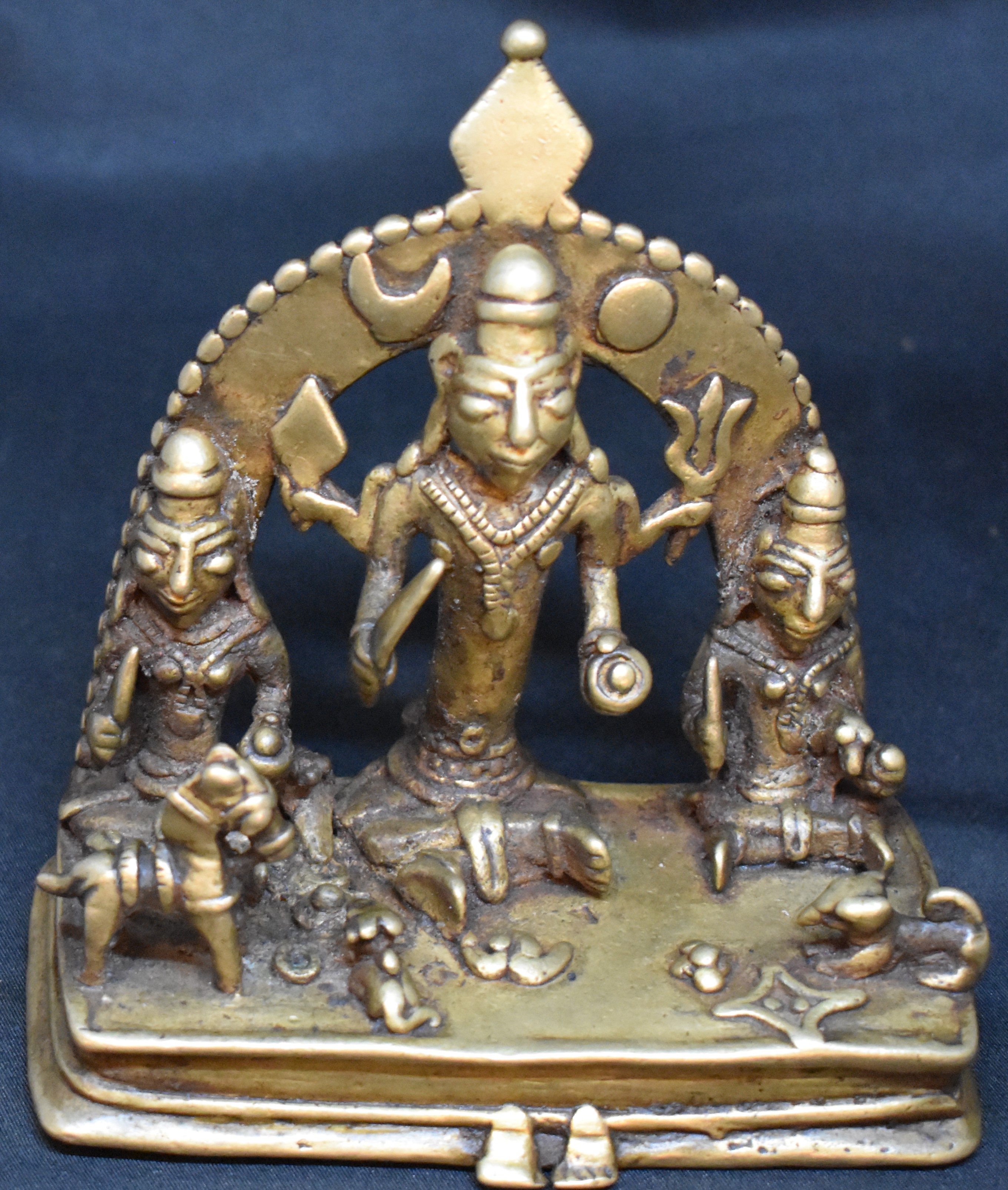 This is Khandobha and his consorts seated ona platform full of sacred objects. The identification of Khandobha is through his attributes sword, drum, Trishul and a skull cup (clockwise starting from his lower right hand). The presence of a horse (our left side) and a dog (on our right side) reinforces the identification.
