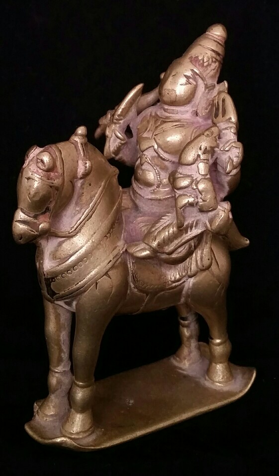 This is Khandobha with Mahalsa, his consort. Khandobha is closely associated with Siva. The Trishul in his left upper hand marks that association. In this case, Khandobha is identified through his Vahana, a horse, and his attribute Trishul.