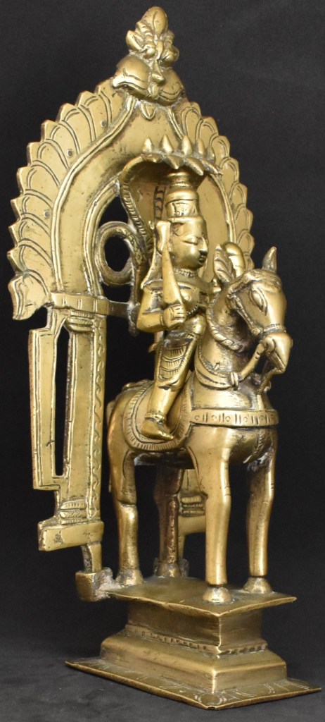 The backdrop is full-length prabhavali with Kiritimuka, the face of glory, and a five-hooded cobra. The absence of Makara in the prabhavali suggests this bronze may be from the Northern part of West Deccan, South Maharashtra. A complete set of Khandobha, like this one, horse, deities and prabhavali, is rarer.