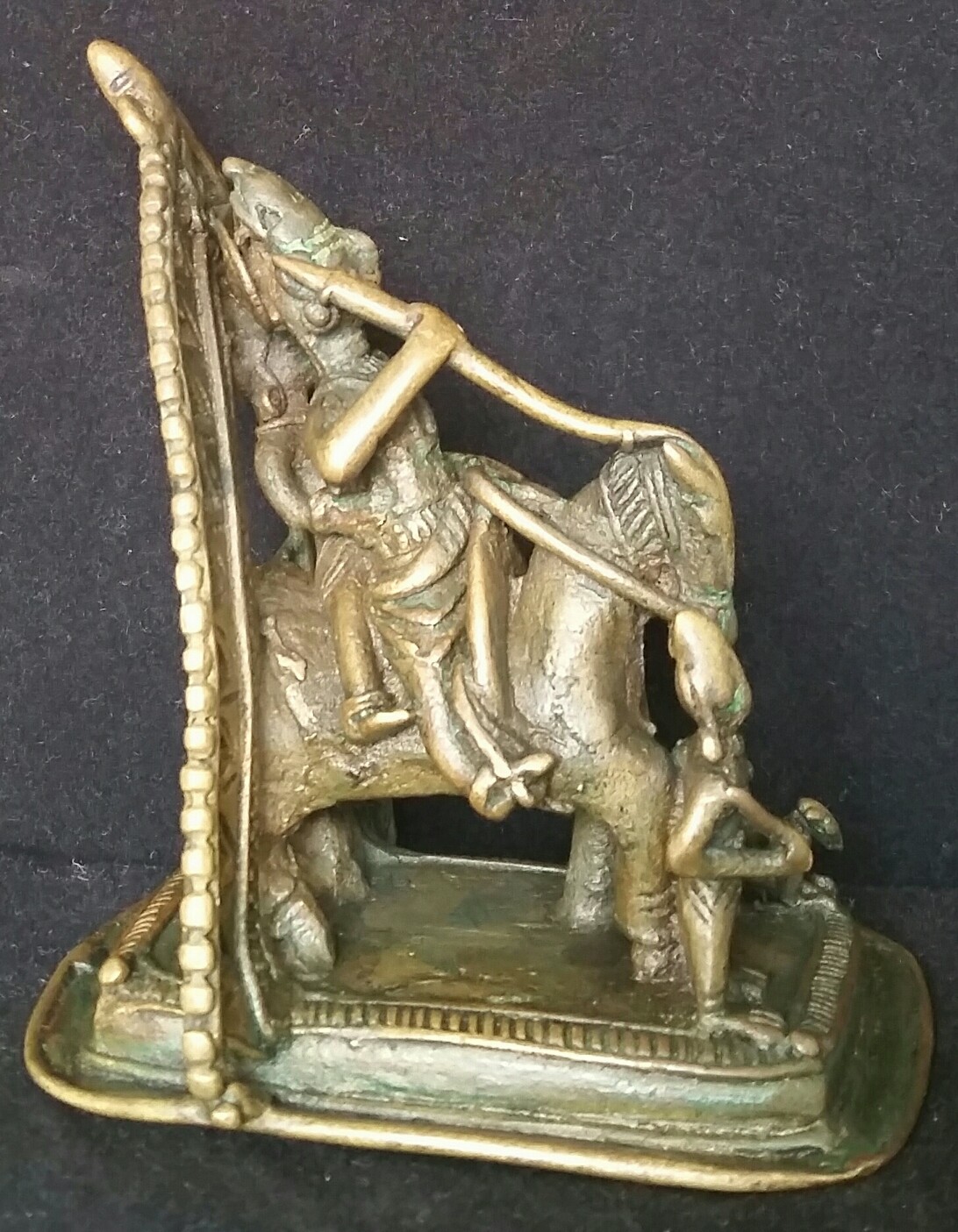 Khandobha and his entourage are framed by a triangular prabhavali with a pierced pattern. The rectangular base is stepped. The edge of the top of the base is patterned and it matches the pattern on the inner edge of the prabhavali. Attention to detail.