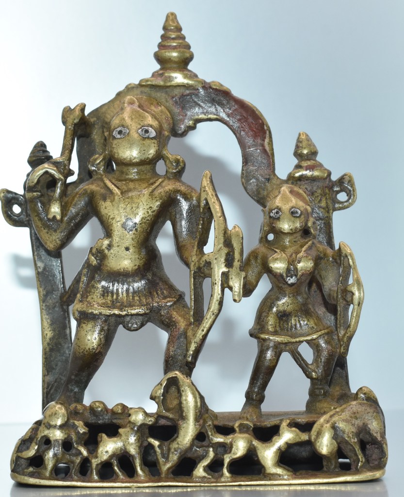 This is a narrative bronze, depicting a scene from a Puranic story. It depicts Shiva and Parvati as a Kirata couple. Kirata refers to people who live in a mountainous region.