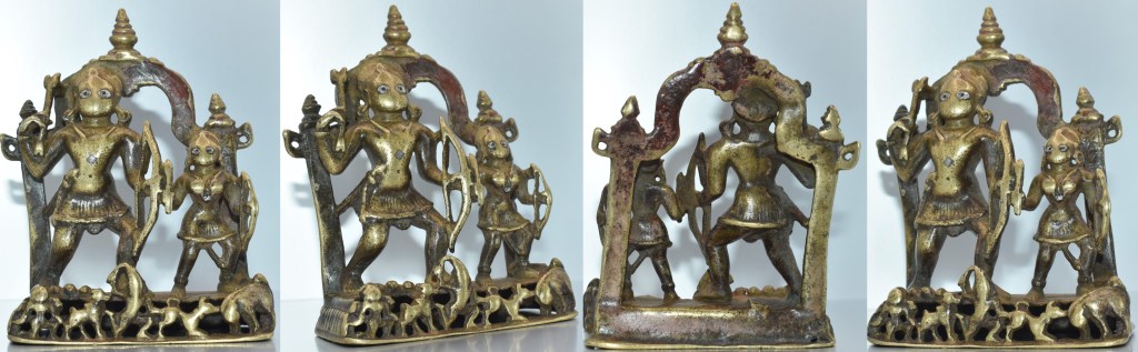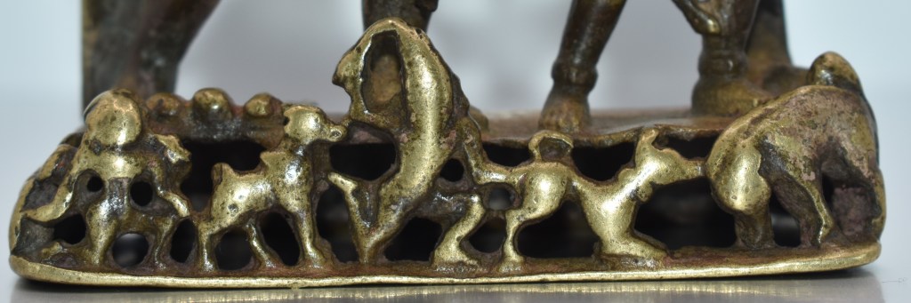 The bronze: The figures on the front of the pedestal tell the story. From our left: it is four-armed Shiva kneeling to shoot the Mukasura, bull Shiva’s vahana, Arjuna reaching for his arrow, a dog that accompanies the hunter Shiva and Mukasura as a pig.