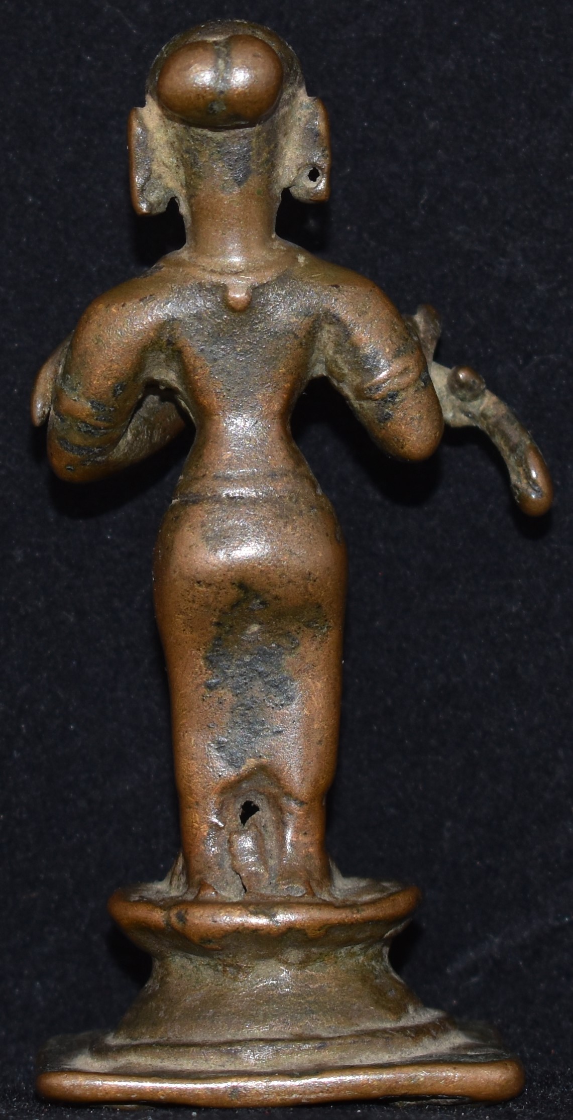 Here the saint is standing in Sampada, erect without any bend, holding a stringed musical instrument. The posture could be interpreted as standing in reverence. Appears to strum with her left hand.