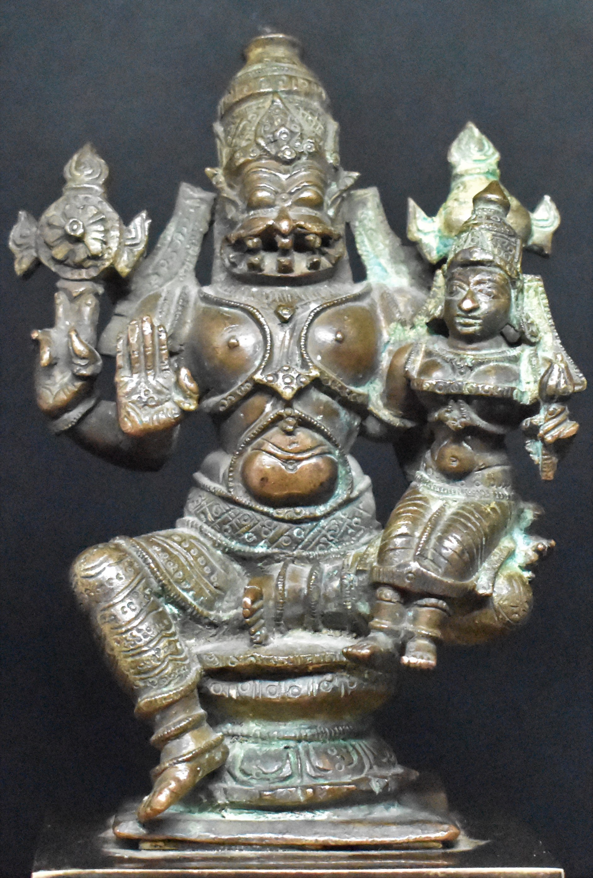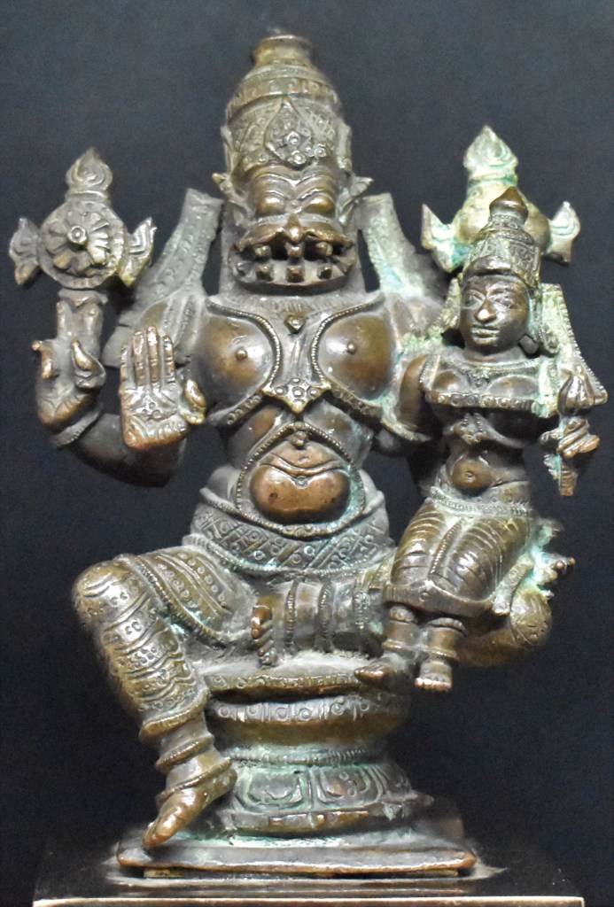 Narasimha is shown with four hands. The rear hands are holding Vishnu’s attributes Chakra and Shankha (Discuss and Conch). His lower right hand is in Abhaya (protection) mudra and he is holding Lakshmi with his lower left hand. He is seated in lalitasana with Lakshmi sitting on his left lap. Lakshmi’s legs are pendant. Lakshmi is holding a lotus in her left hand and her right hand is holding Narasimha.