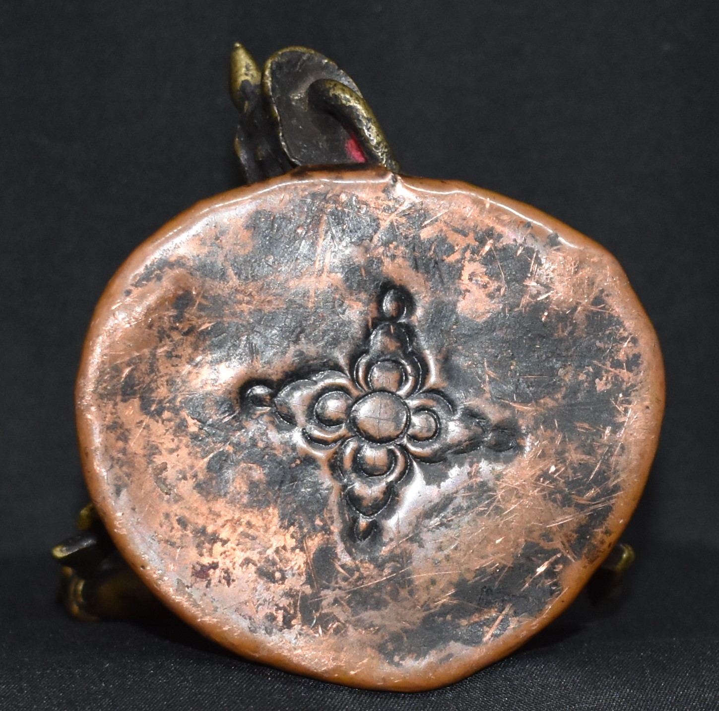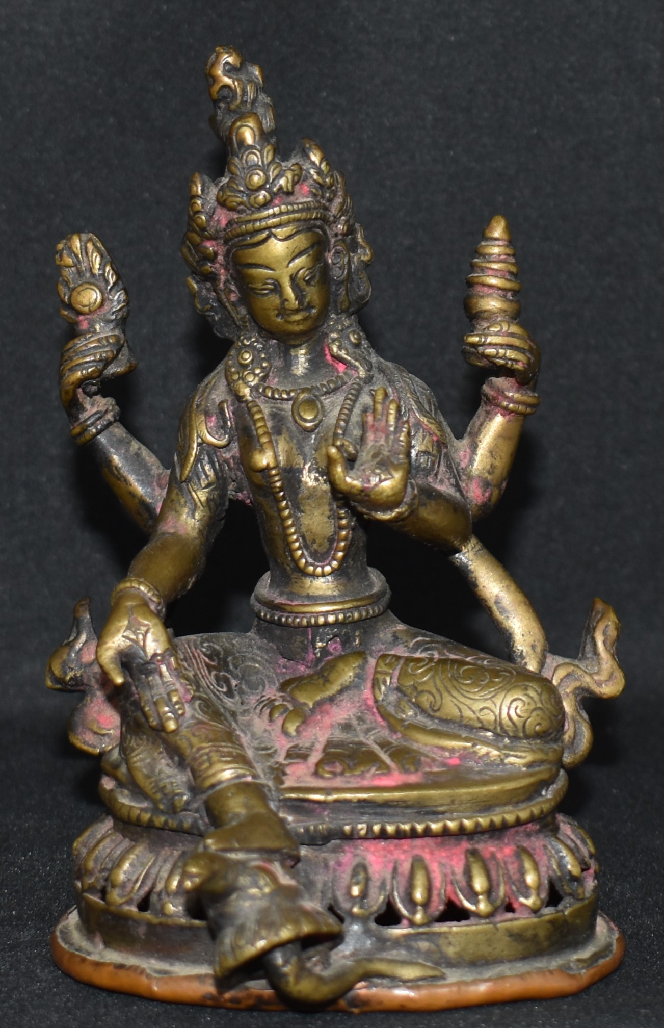 Note: Nepal is known for its handicrafts and Lakshmi is one of the popular topics. In this case, the presence of her vahana, consecration plate and mark, wear in her face and the way the mirror and vermillion pot is held suggest this may be a ‘non-handicraft’ bronze.