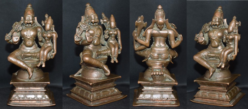 Narasimha is identified through his leonine face and human body and the attributes Chakra and Shankha. Lakshmi’s identification is by association and her breast band. Lakshmi is perched on Narasimha’s left thigh.