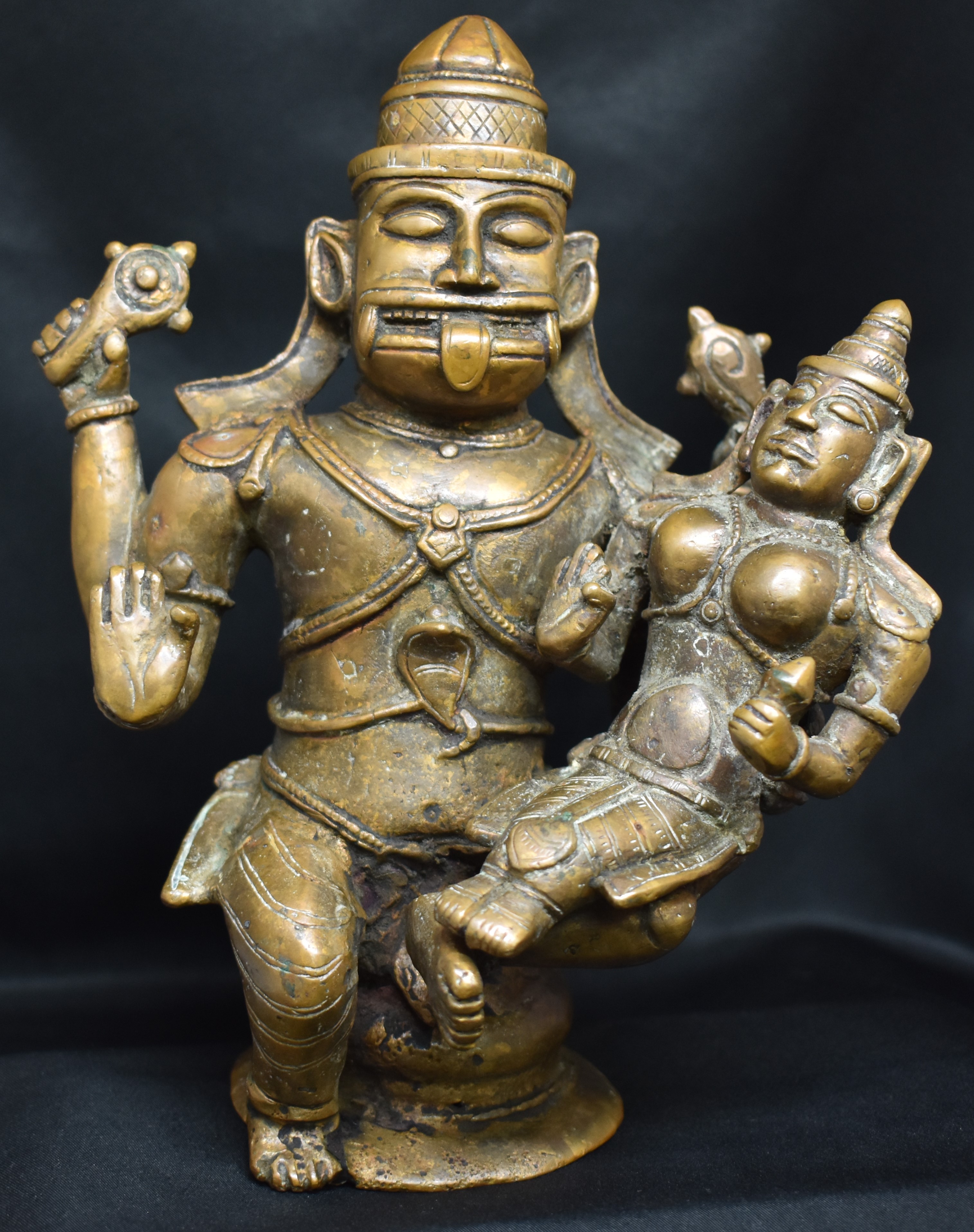 This is Lakshminarasimha, an avatar of Vishnu. The chakra and Shanka (Wheel and Conch shell) identify him as such. The open mouth with protruding tongue and striking display of canine teeth indicate the ugra (ferocious) aspects of this man-lion avatar. Lakshmi is identified by association. The reasons for the absence of the mane are not known.
