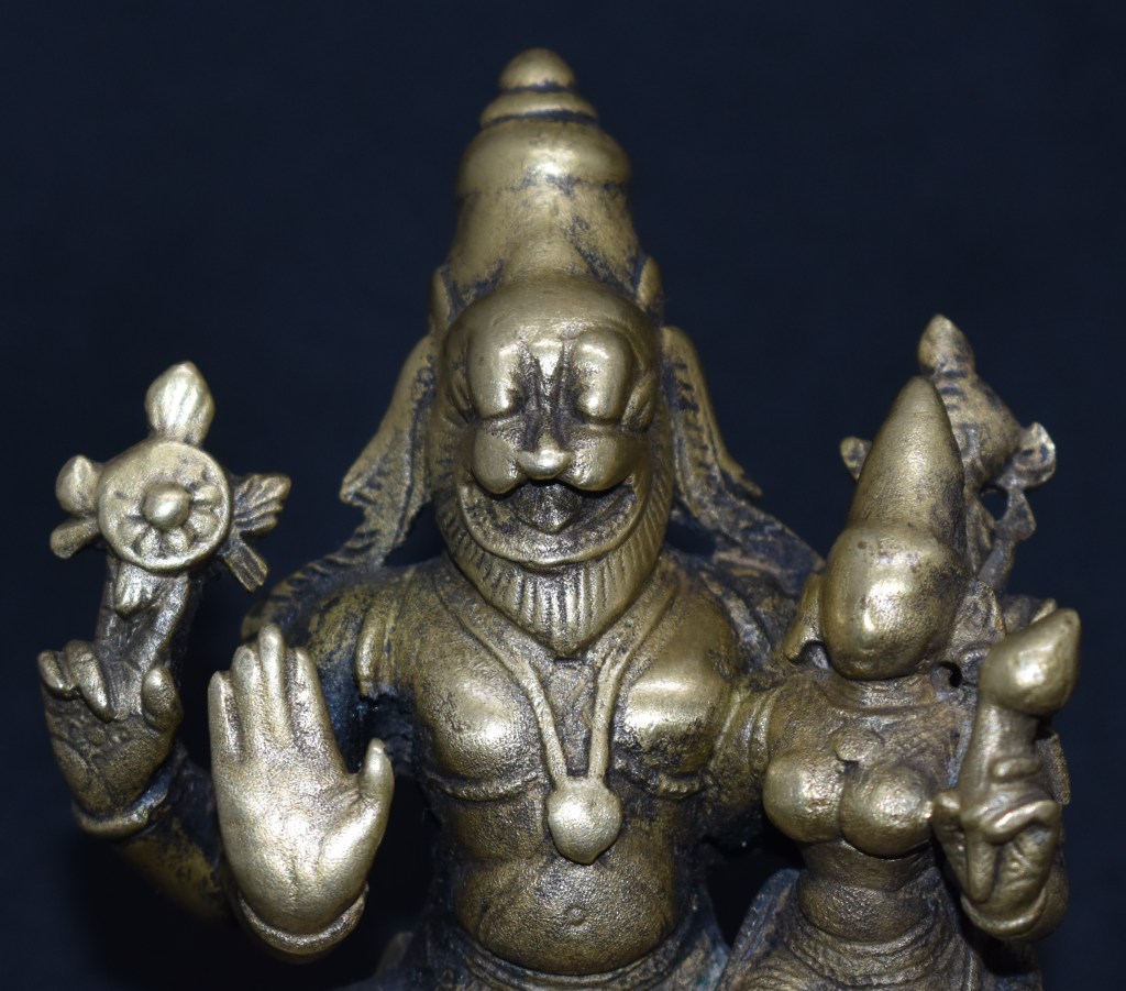 This representation of Narasimha with Lakshmi is one of the Shanta (peaceful) forms of Narasimha. This iconography is widely used in home worship.