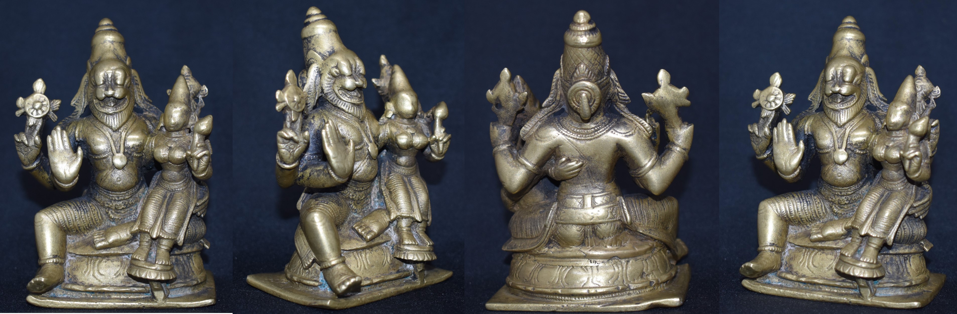 According to the Vaishnavite version, as written by the then Head of Srirangam mutt, ” Narasimha was angry at the time of the slaughter of Hiranya and has his Raudra, ‘quality of ire’ did not go down even after the destined function of his avatar ie Hiranya Vadham. He was cooled down when Lakshmi came and sat on his lap or according to another account Prahalada, Narasimha’s devotee appealed to the Lord to get himself appeased”. Hence this iconography. This blog site has a representation of Lakshminarasimha with Prahalad.