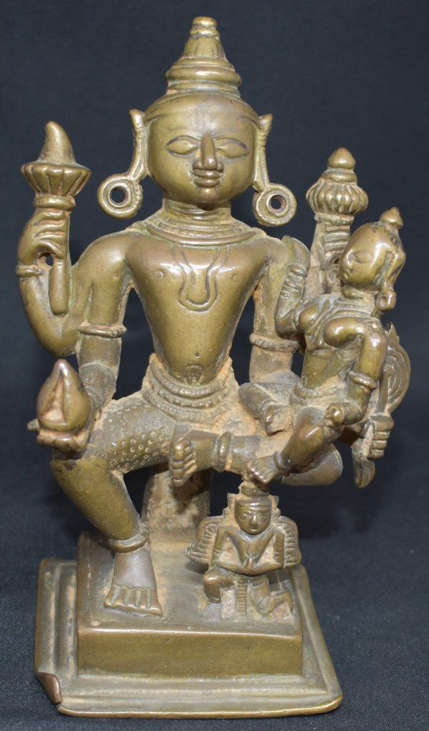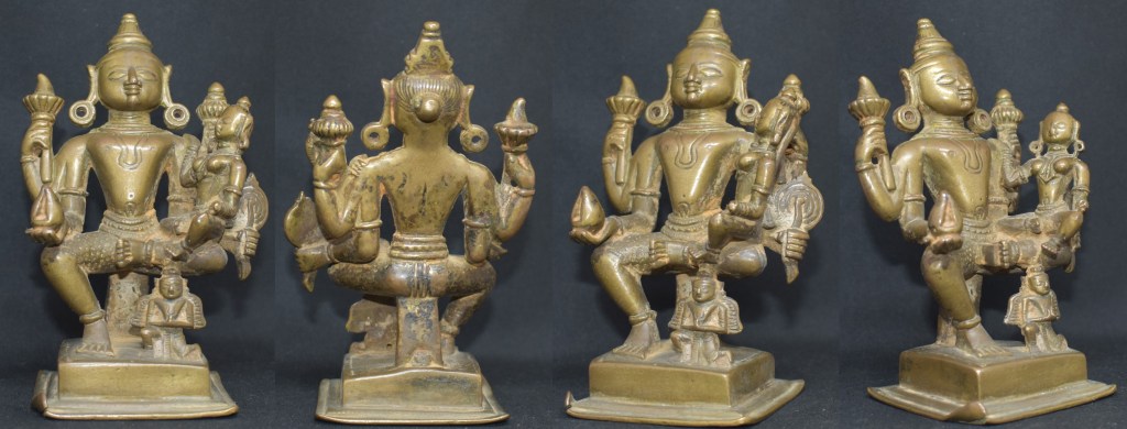 Four-armed and holds Shankha, Padma, Gada and Chakra (Conch Shell, Lotus, Mace and Wheel) in his hands and is perched on vertical support. Vishnu’s consort, Lakshmi, is sitting on Vishnu’s left lap.