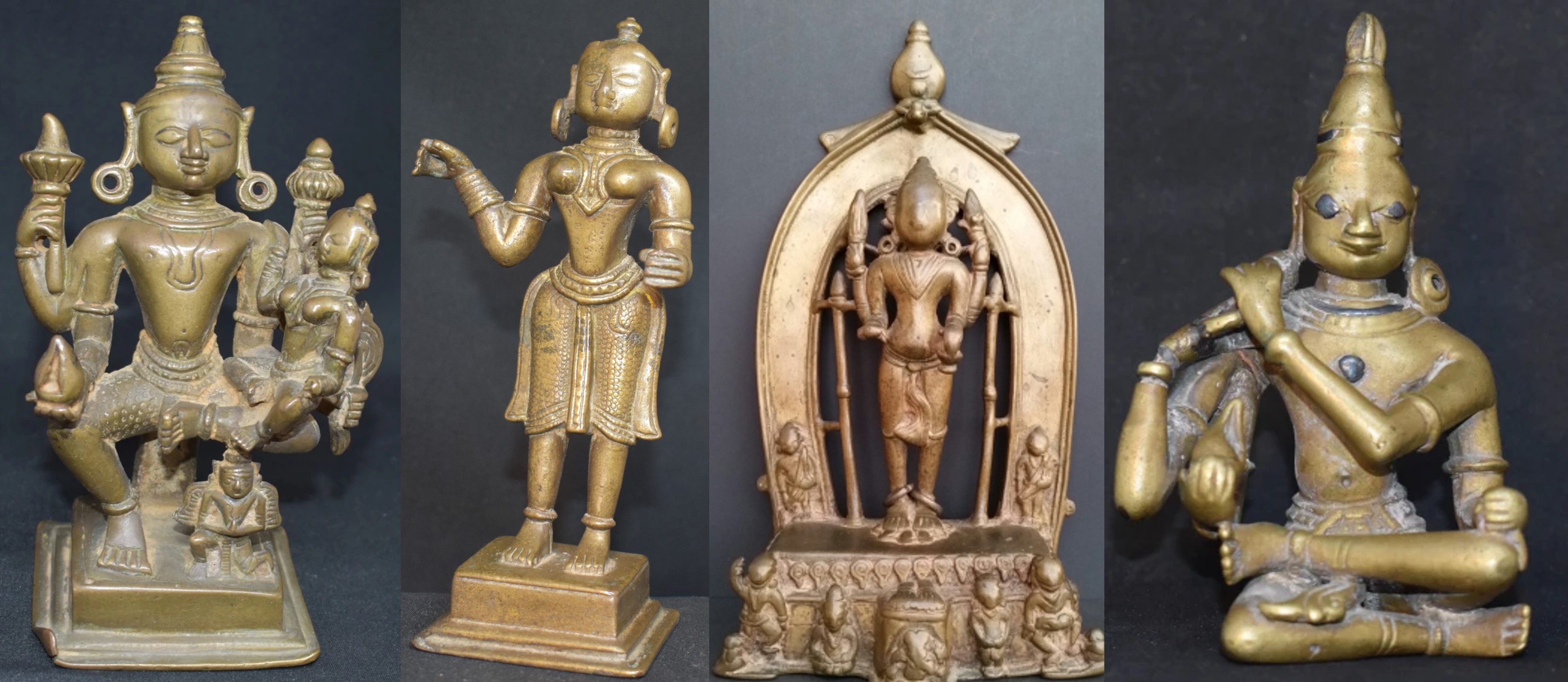 Below is a set of four Vigrahas, including the subject of this blog. The feature to note is the earrings. All are round. It seems to be a special feature of bronzes from Gujarat. Something to follow up.