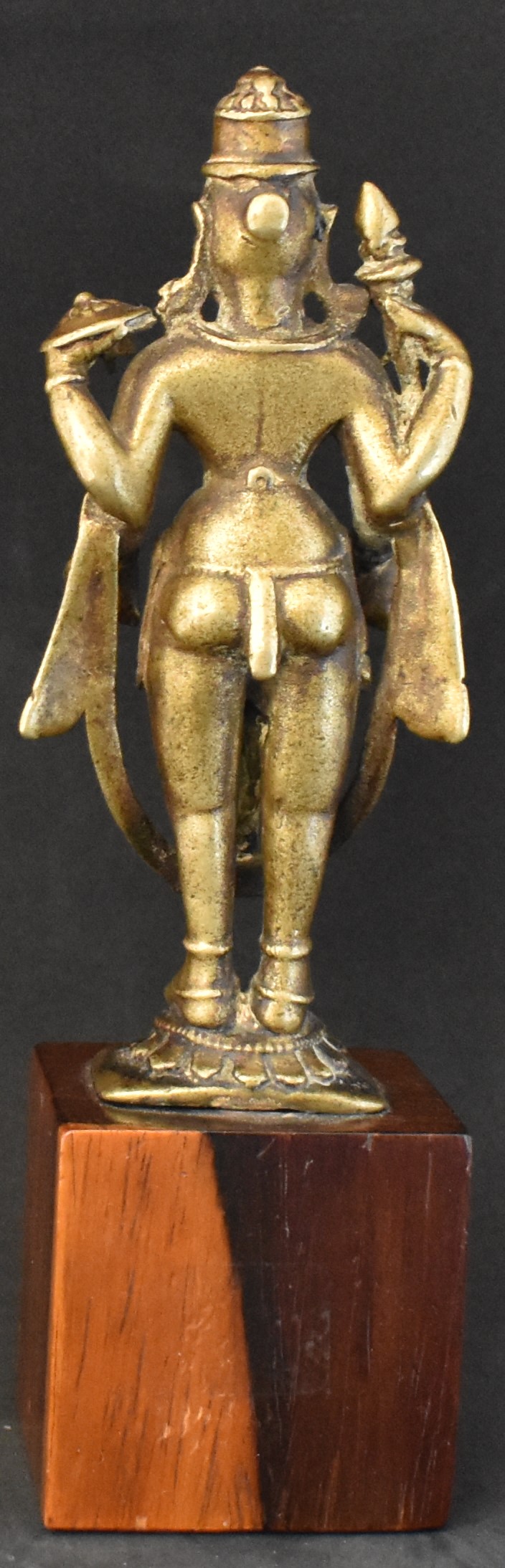 The Vigraha is about 12 cm high and it is most probably from Central or Western India. The idol may be dated to the Prathihara period, about the eleventh century. The degree and the pattern of wear are consistent with expectation. Compare the front and back view of the top part of the crown to get a sense of the wear.