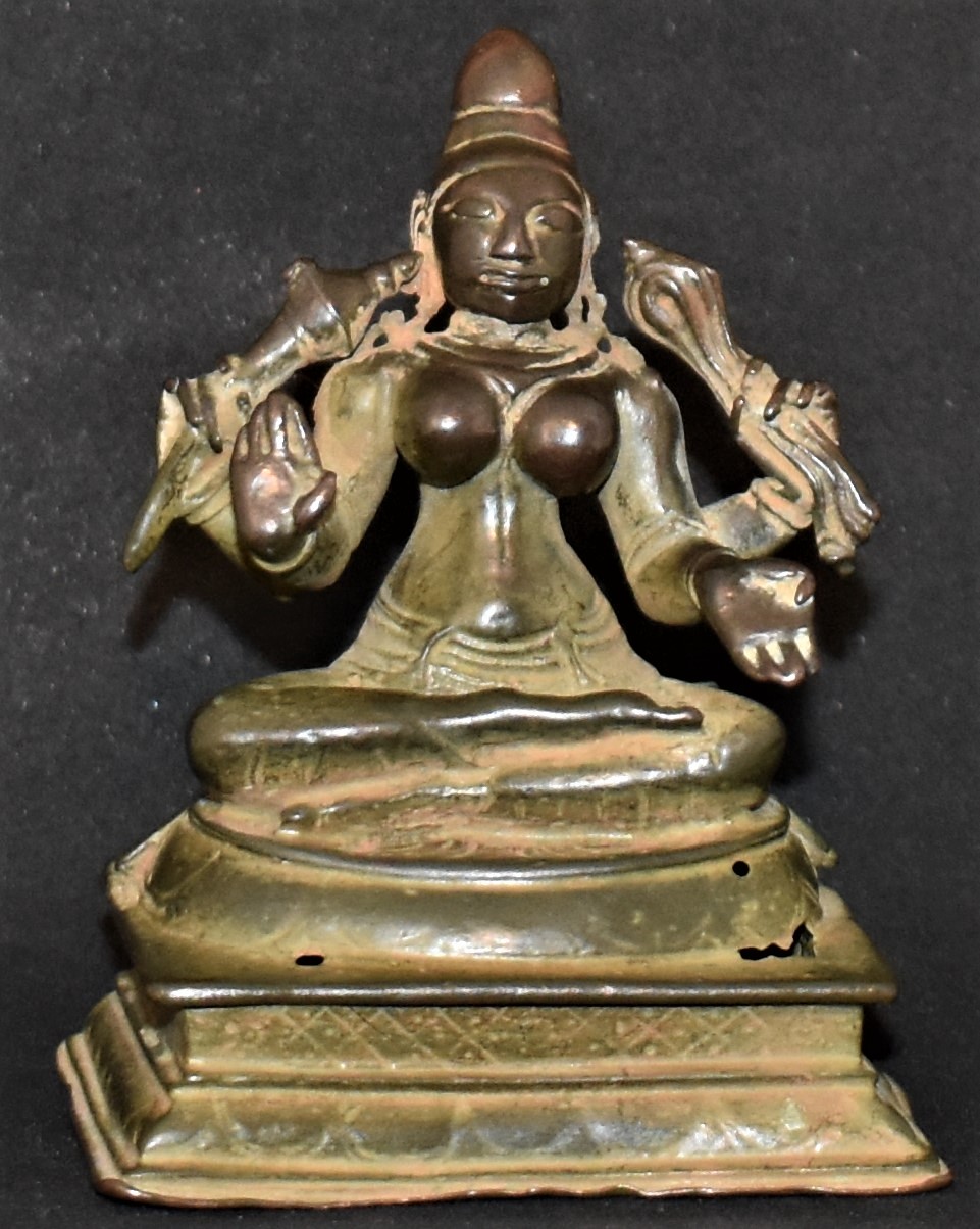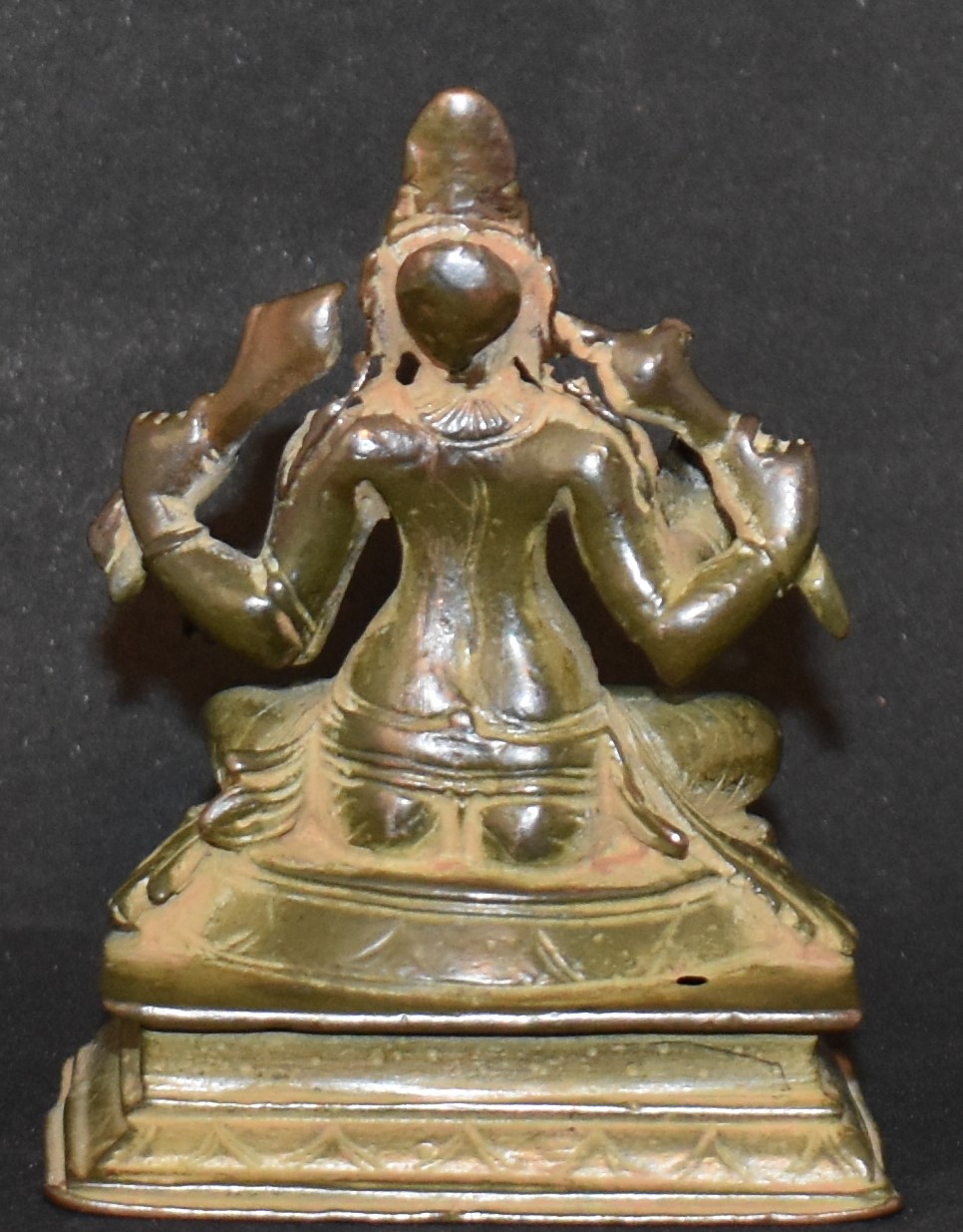 The patina is dark signifying considerable age. There is some bronze loss as well. The vigraha is about 8.5 cm in height. It is from Tamil Nadu and may date to the sixteenth century.