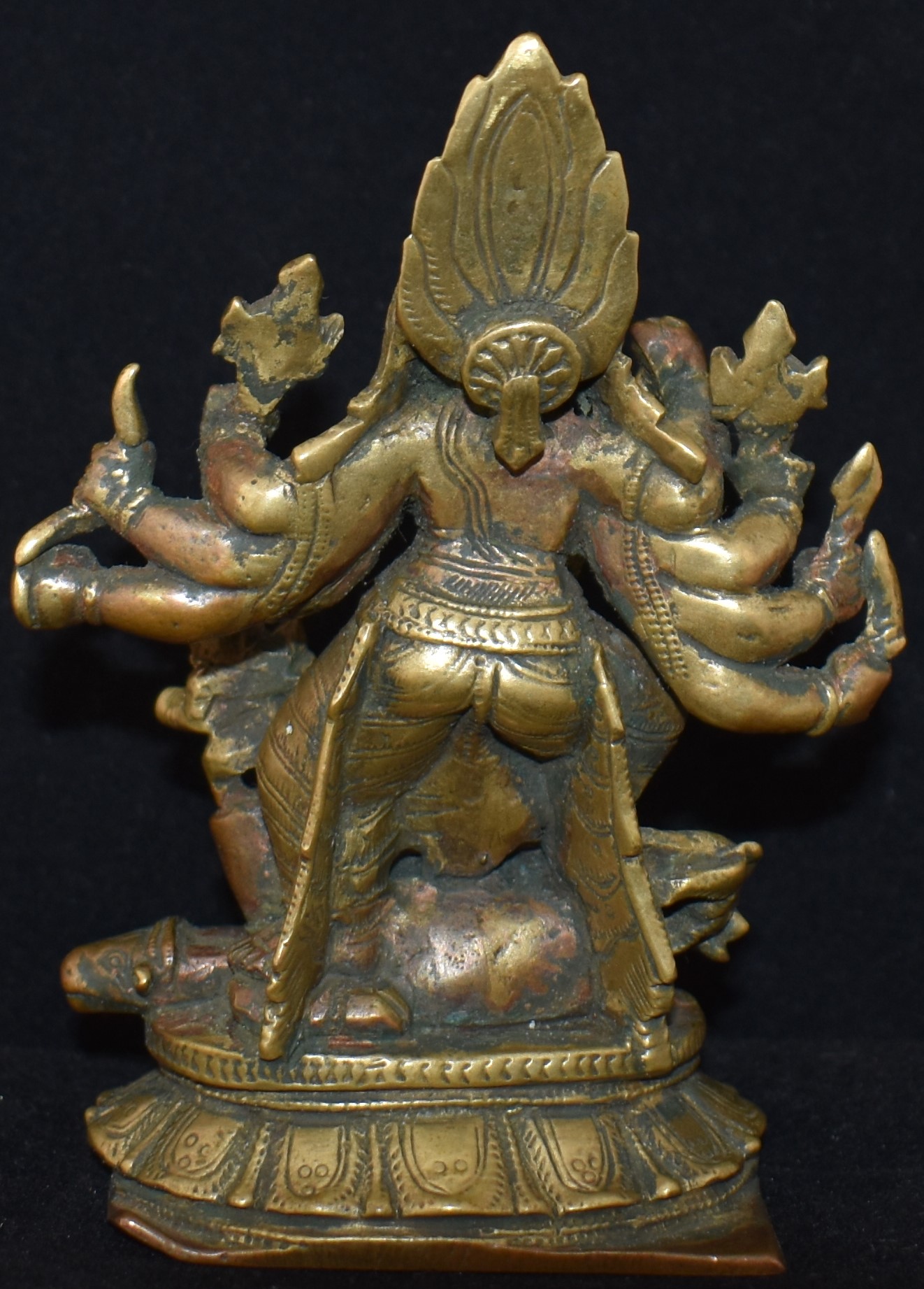 Among the notable aspects are the diminutive size of Mahisha, lion attacking the buffalo’s hind, the flames surrounding the crown (compare it to the flames of Bhairava) and the severed head of buffalo lying on the pedestal.