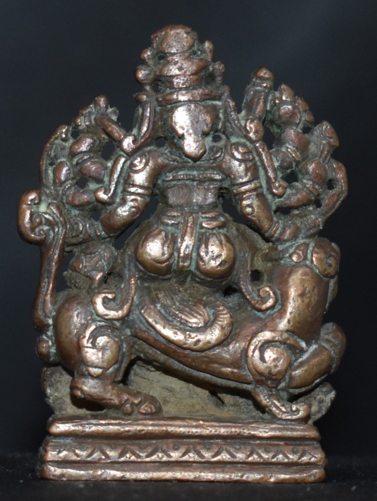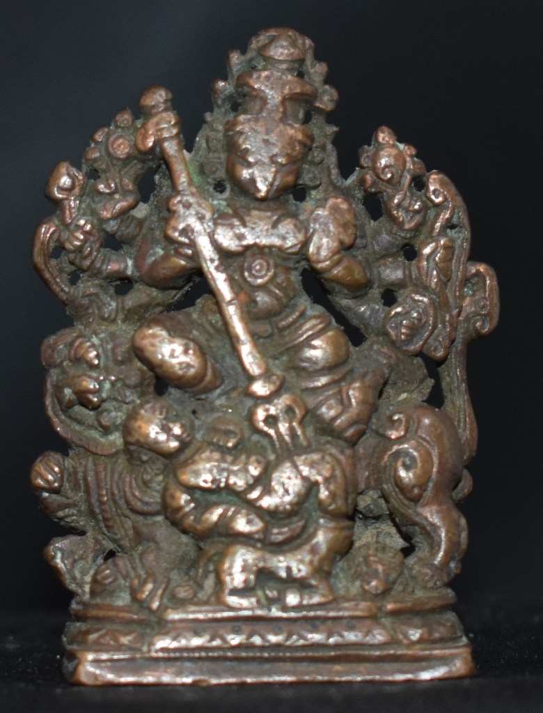 The bronze shows Mardhini sitting on her vahana, a lion, with Mahisha resting horizontally on the buffalo he was pulled out of. The severed head of the buffalo is on our right, between the buffalo’s body and the lion’s hind legs.