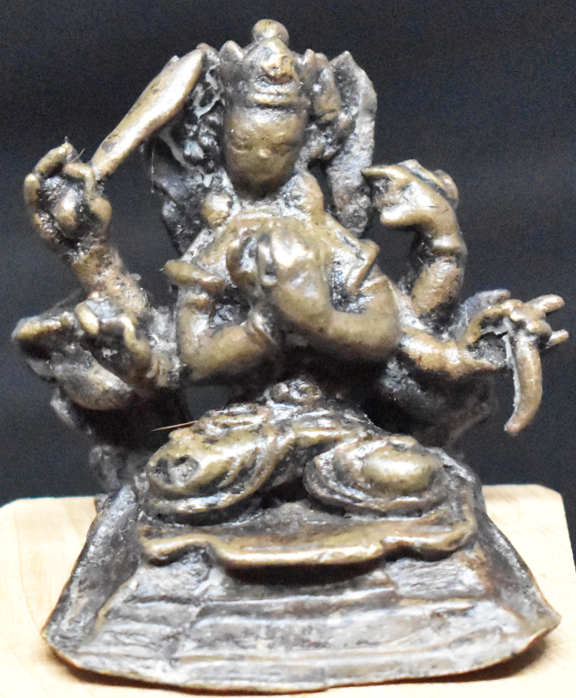 This six-armed Vigraha is identified as Manjushri on the basis of the sword and hand mudra. With three heads (The head on the left is discernible) and six arms, it is an esoteric manifestation of bodhisattva Manjushri.