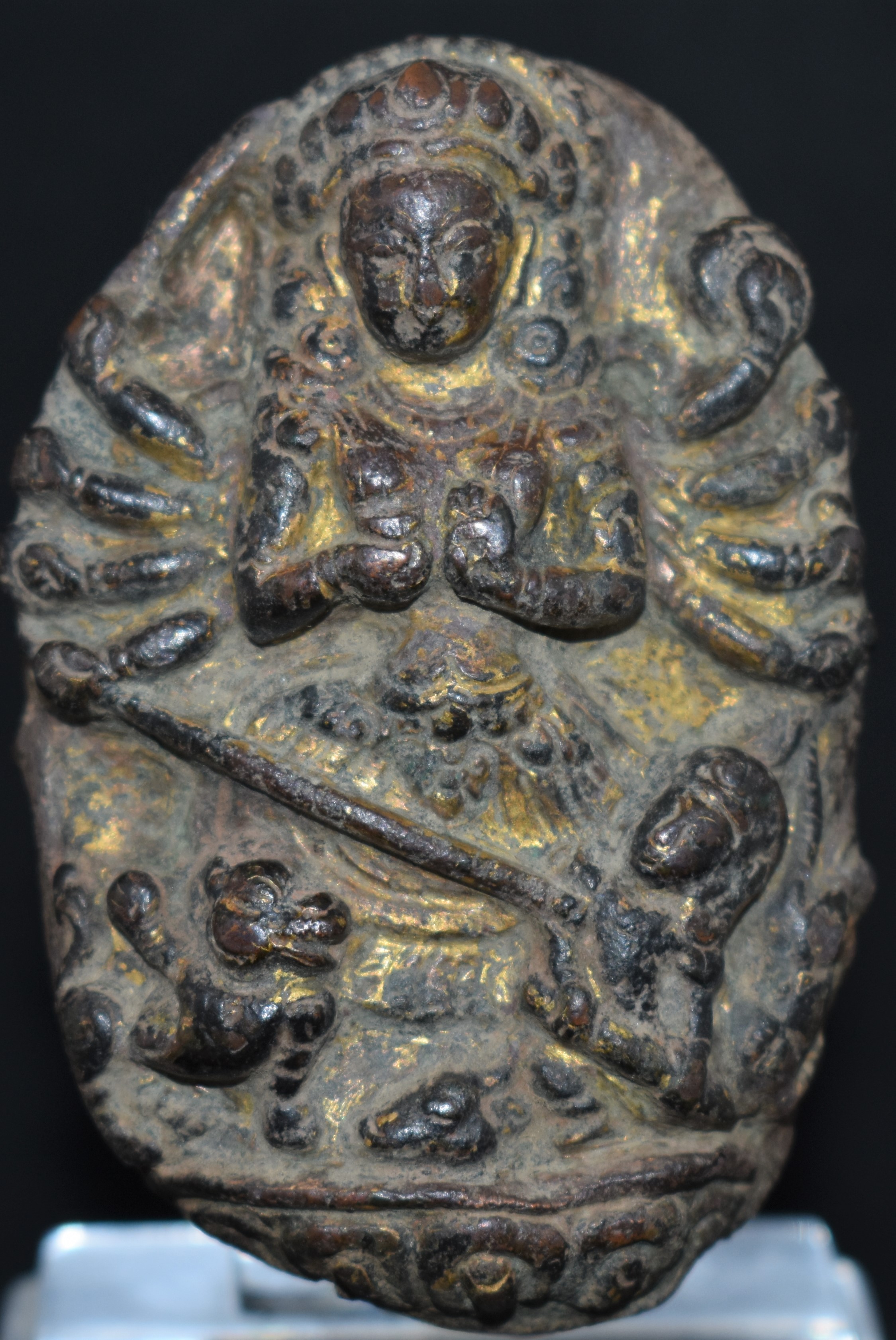 The ‘bronze’ (repousse) is about 6.5 cm in height. The remnants of gilding are visible. This may have been part of a Torana and may date to the eighteenth century or earlier.