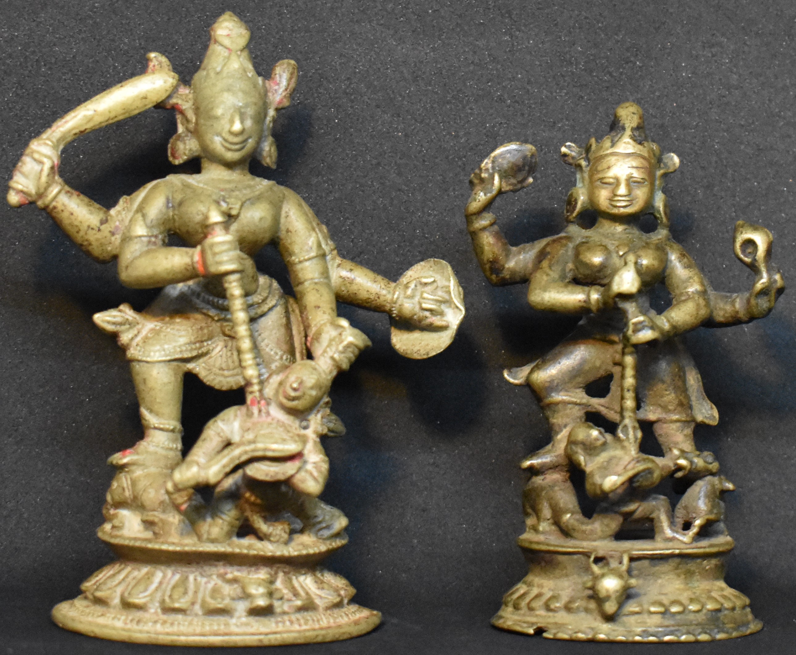 On this site, there is an example of Mardhini from Orissa holding discuss and conch in her rear hands and plunging Trishul, held with both front arms, into the demon’s chest. I have included photos of the two Mardhini’s for comparison. The similarity of these two bronzes is remarkable.