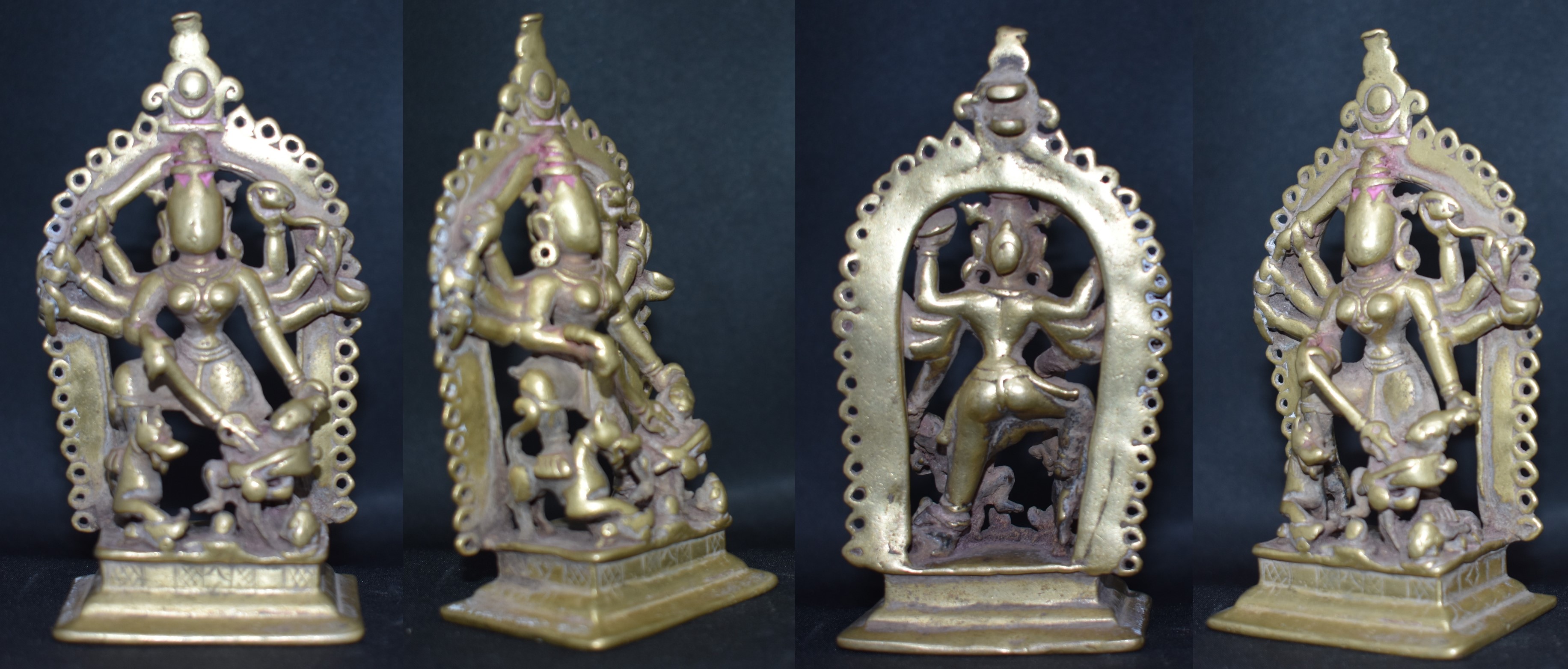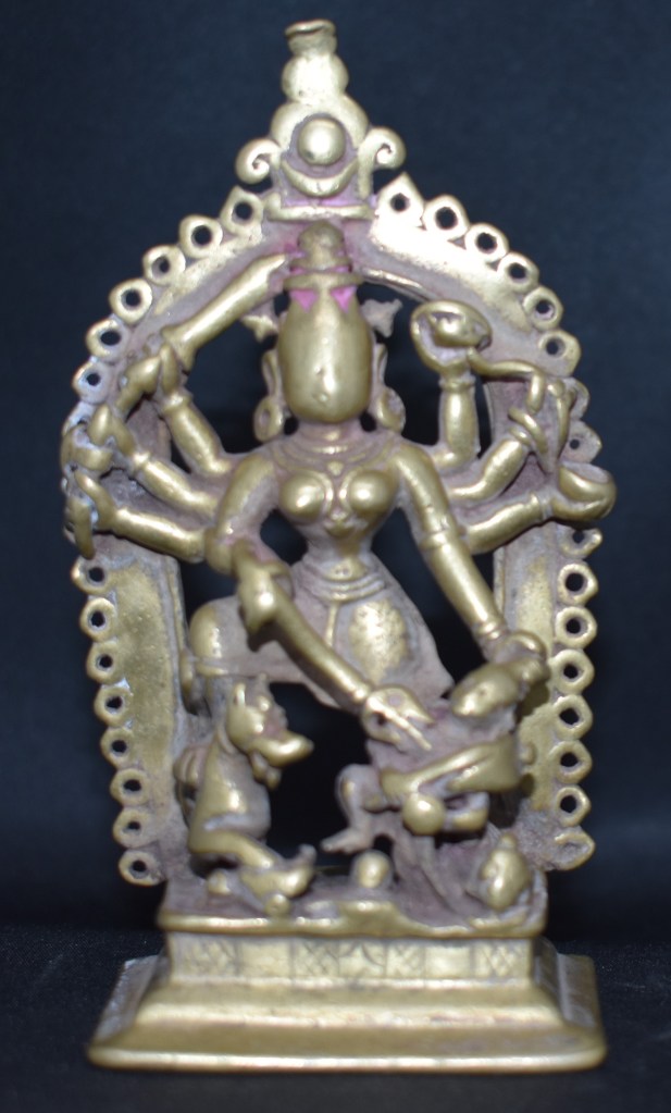 The attributes in her hands are Trishul, Ankusha, bow, sword, shield, arrow, and Kapala, starting from her lower right hand in clockwise. The attributes are to some extent non- standard and do not follow the description given earlier.