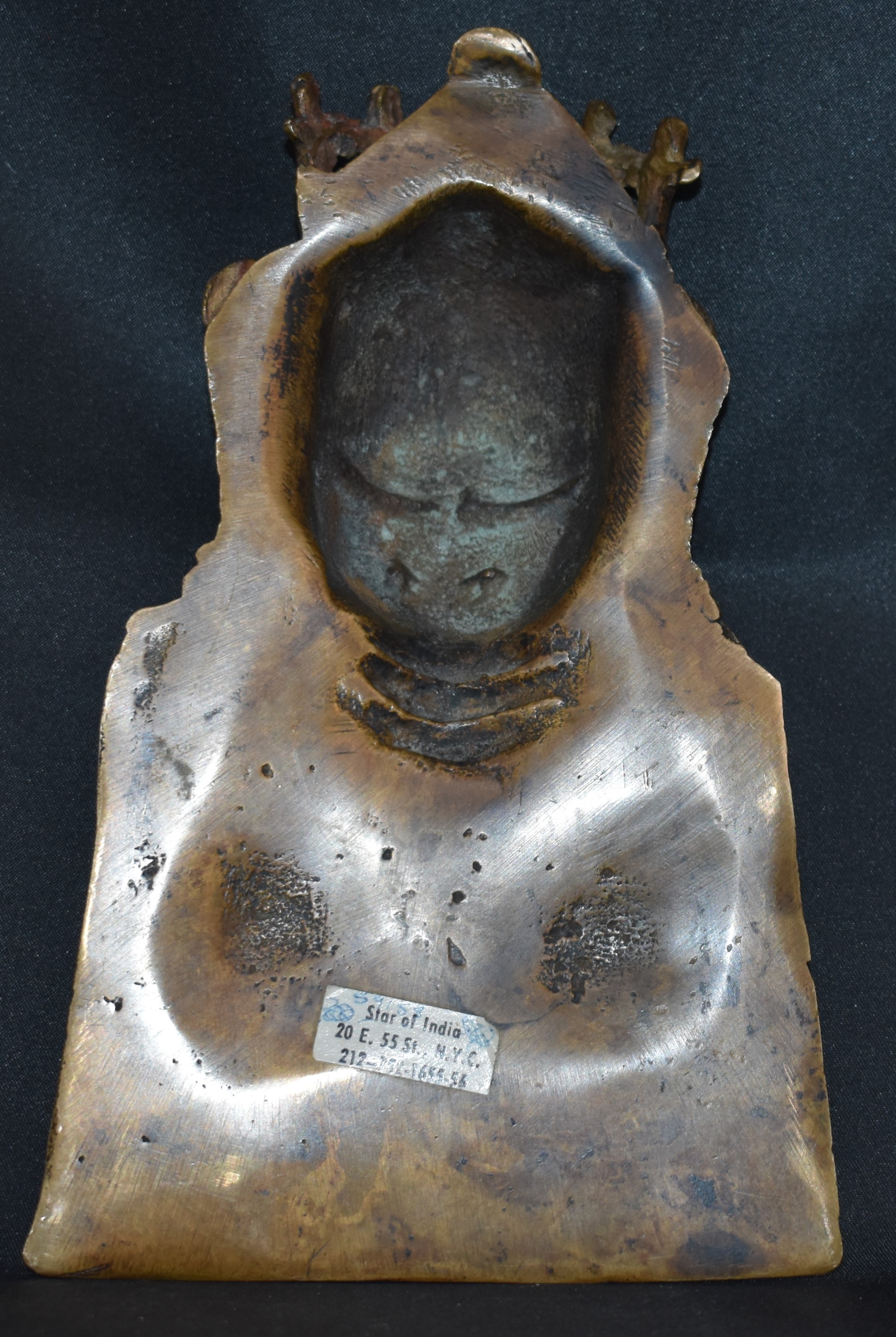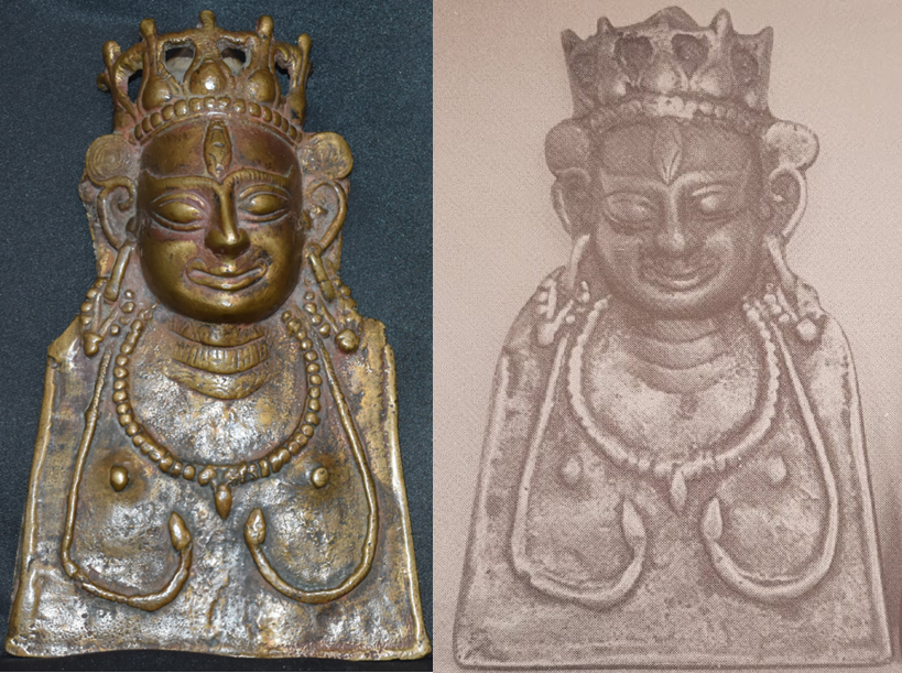 Mohra means mask. But these figures are never used as masks and they are more like a bust. Mohras depict deities. They are from the Himachal Pradesh and its neighboring areas. Mohras are plaques and are either cast or embossed. This is an example of cast Mohras.