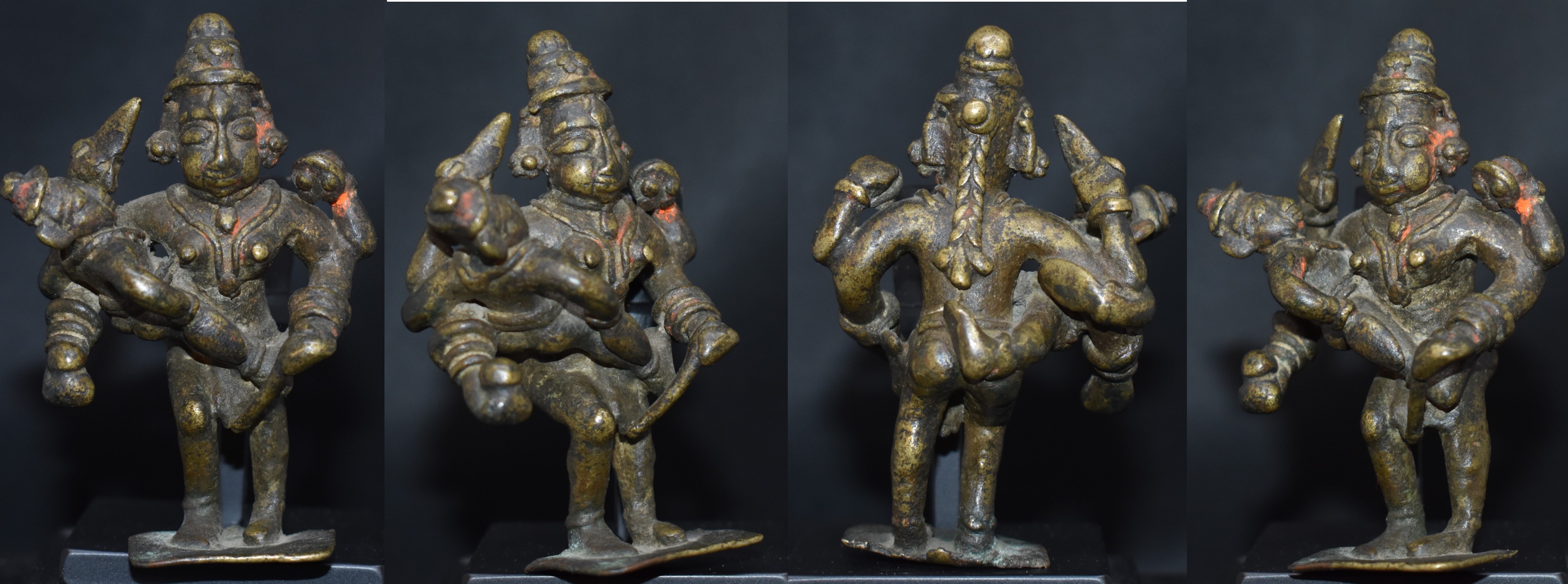 Here we see a Mother Goddess, four-armed and carrying a child. Even with four arms she is not holding the child. What? The upper arms are holding a short sword/dagger and a shield. The attributes in the lower arms are not discernible.