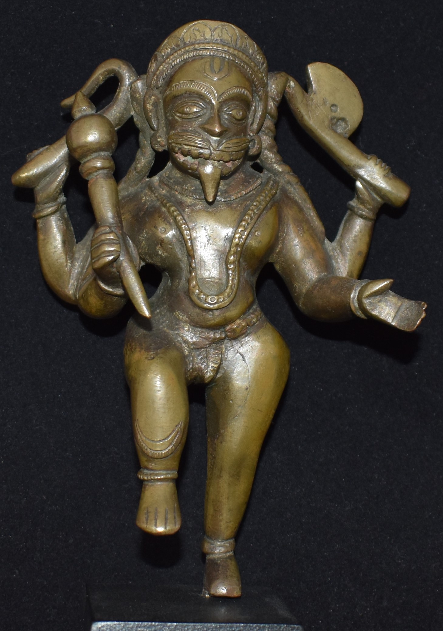 Except for Gada/Mace, the attributes do not fit Narasimha. Axe goes with Parasurama and probably nothing else. Leonine face and plaited hair running down his shoulders attract attention. Strong body. Its back is not worked on.