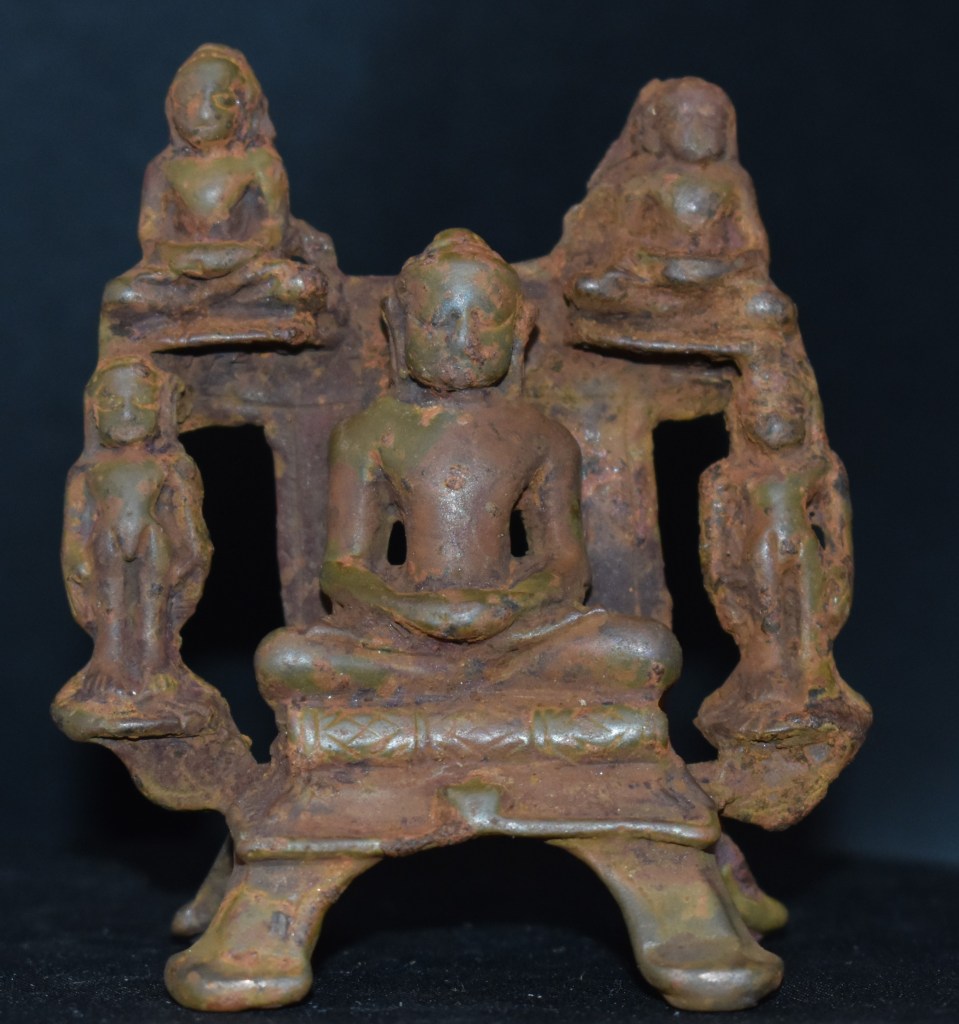Pancha Tirthka refers to a “composition of a seated/standing Jina surrounded by four attendant Jinas”. All the five Jnas are equal in stature. That is what we have here. This Vigraha belongs to the Digambara (sky-clad) sect.