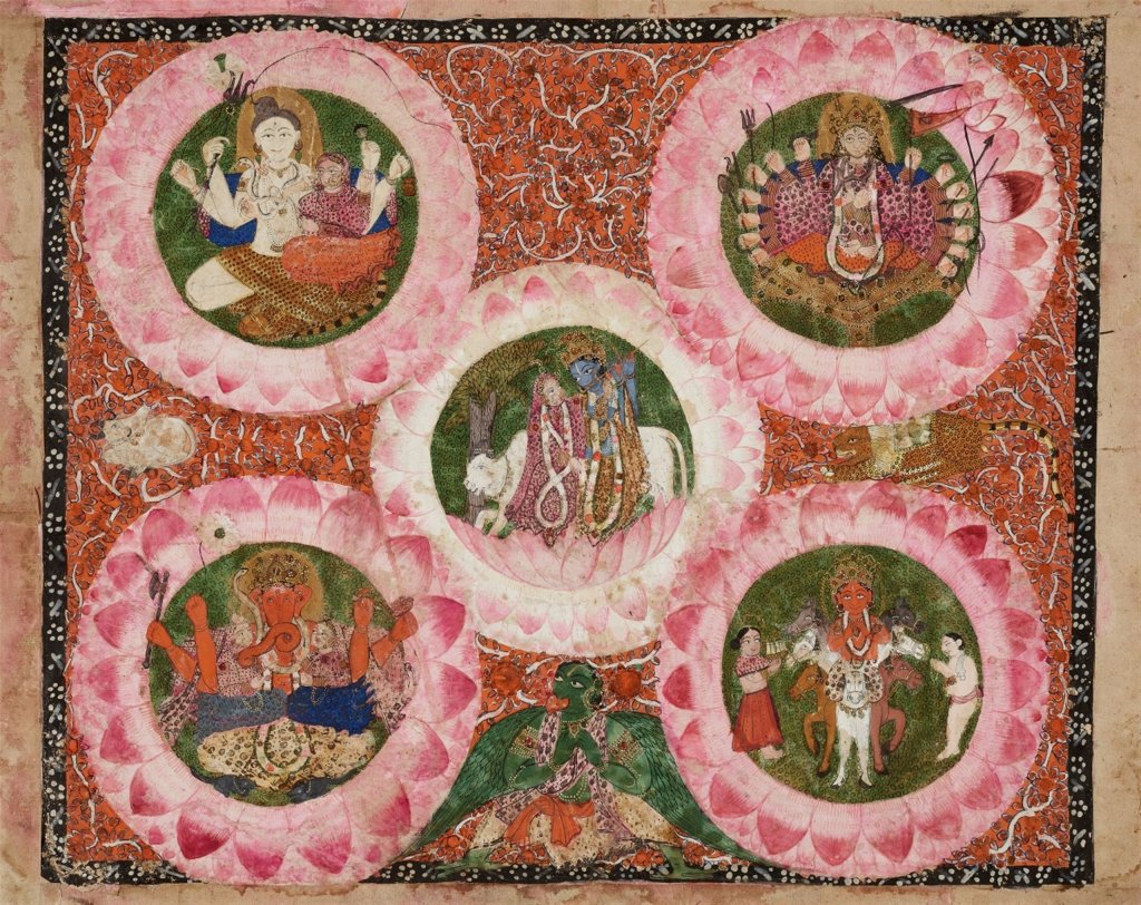 Note: An example of Panchayatna, a painting in my collection, is below. So far I have not come across a bronze group depicting the traditional Panchayatna. An interesting aspect is Vishnu is replaced by Radha and Krishana, as some sects see Vishnu and Krishna as one and the same.