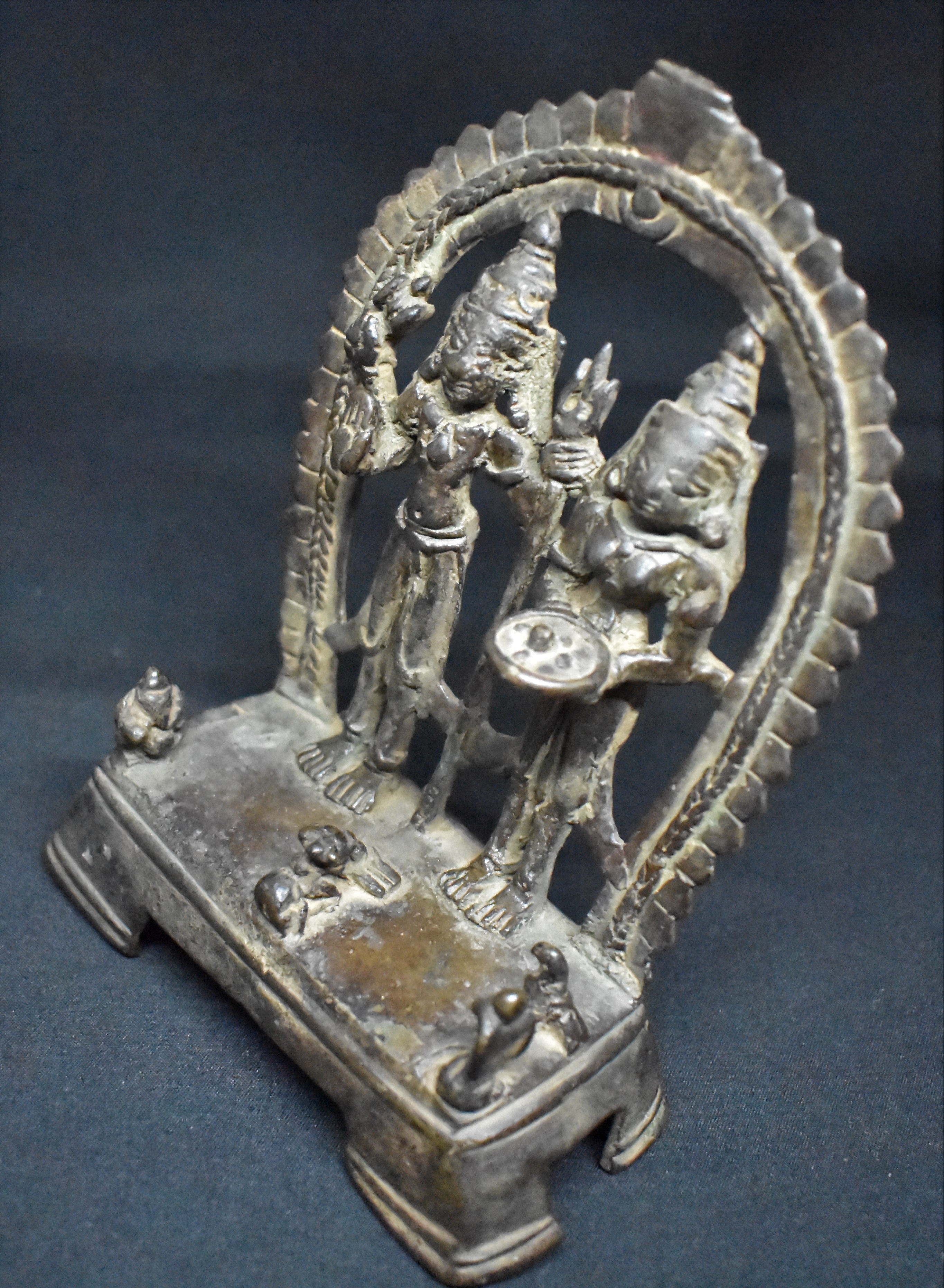 Shiva’s lower right hand is in Abhaya mudra (Protection) and his lower left hand is holding Parvathi by her lower back. Unusual display of intimacy for a folk Vigraha.