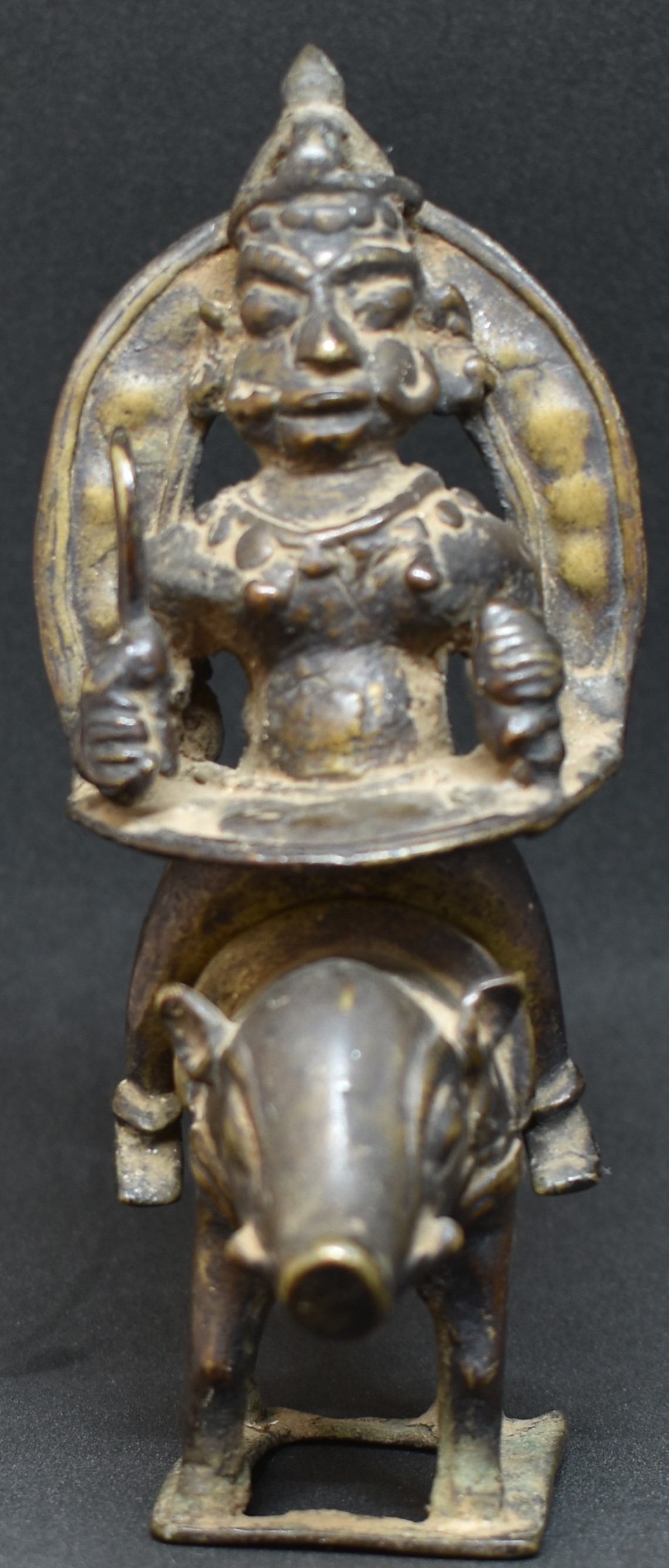 This bronze comes in two parts and may have originated in Malabar region of Kerala. The open inverted basket like crown is one of the identifiers. The black colour is another determining factor. Despite this bronze being from Malabar, it is identified as Panjurli as the traditions in Malabar and Tulu regions are related.
