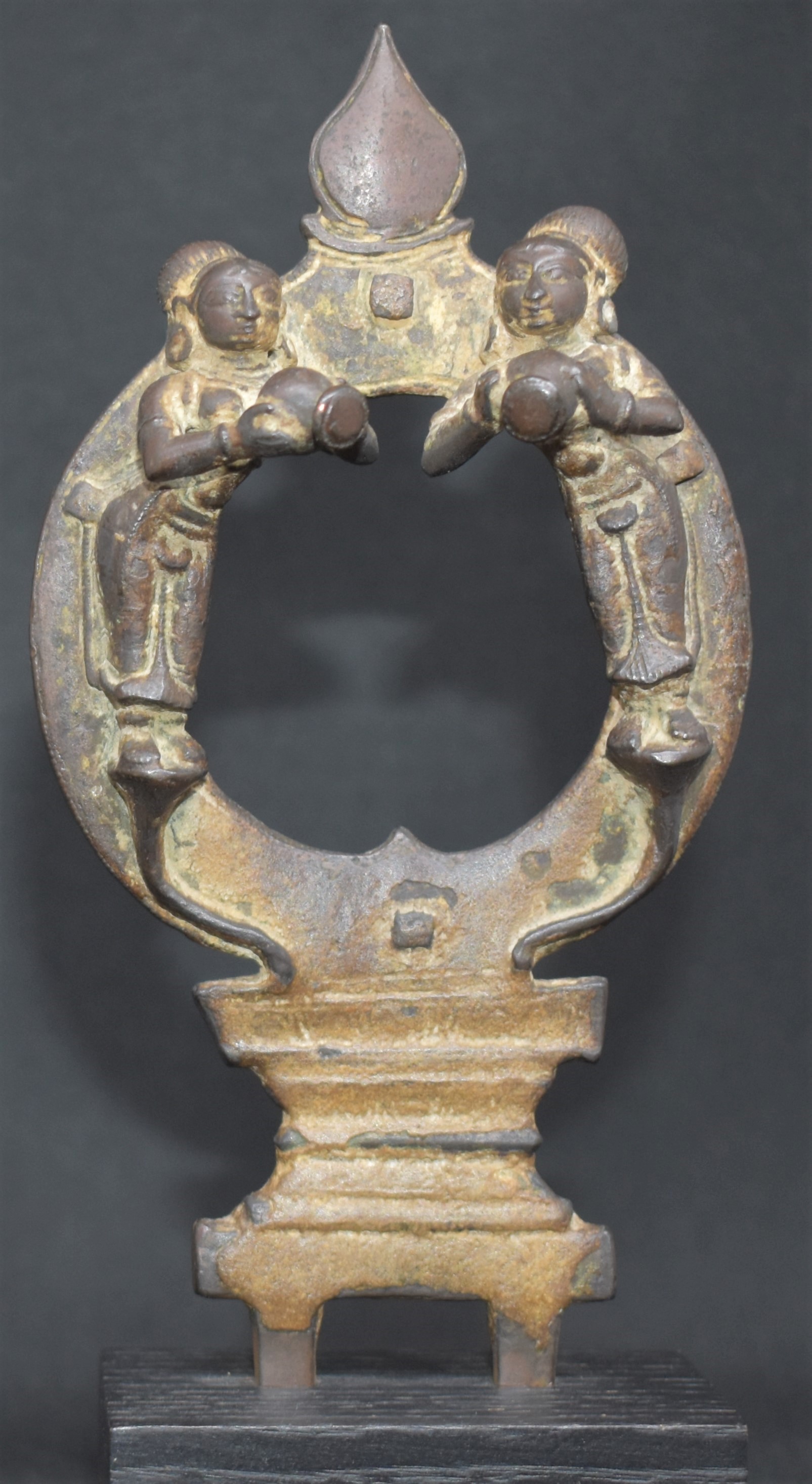 Normally the Prabhavalis for bronze Vigrahas have patterns, floral decorations, flames…and not human figures. Here is an exception.