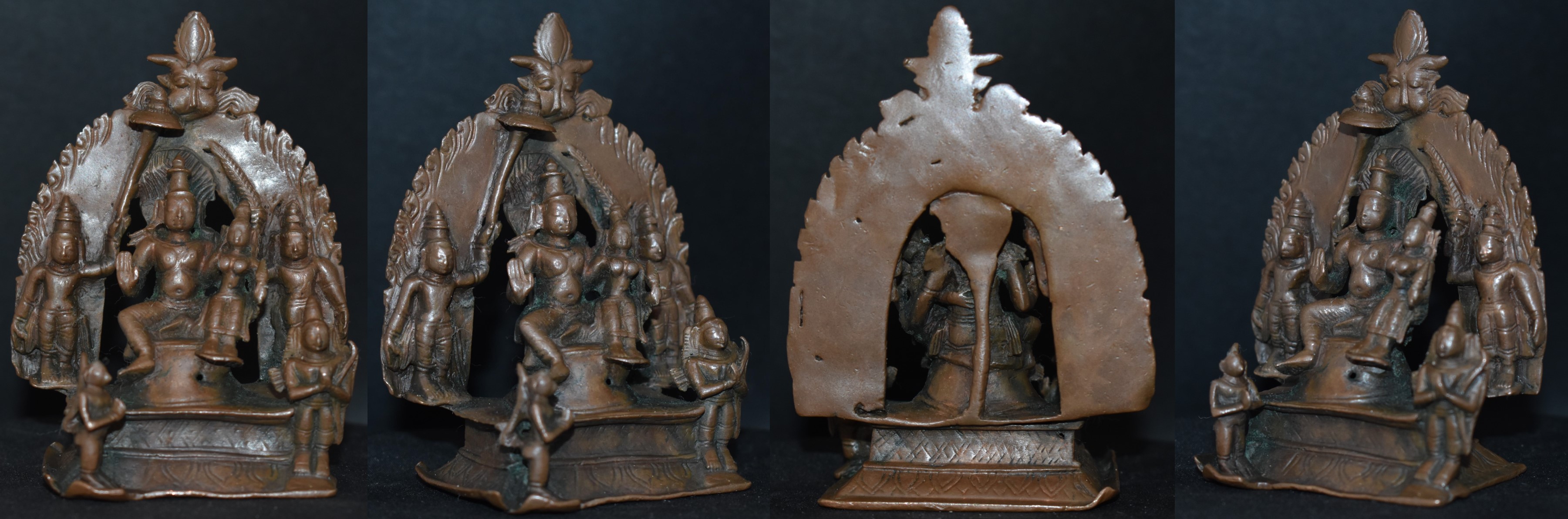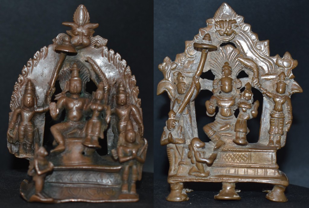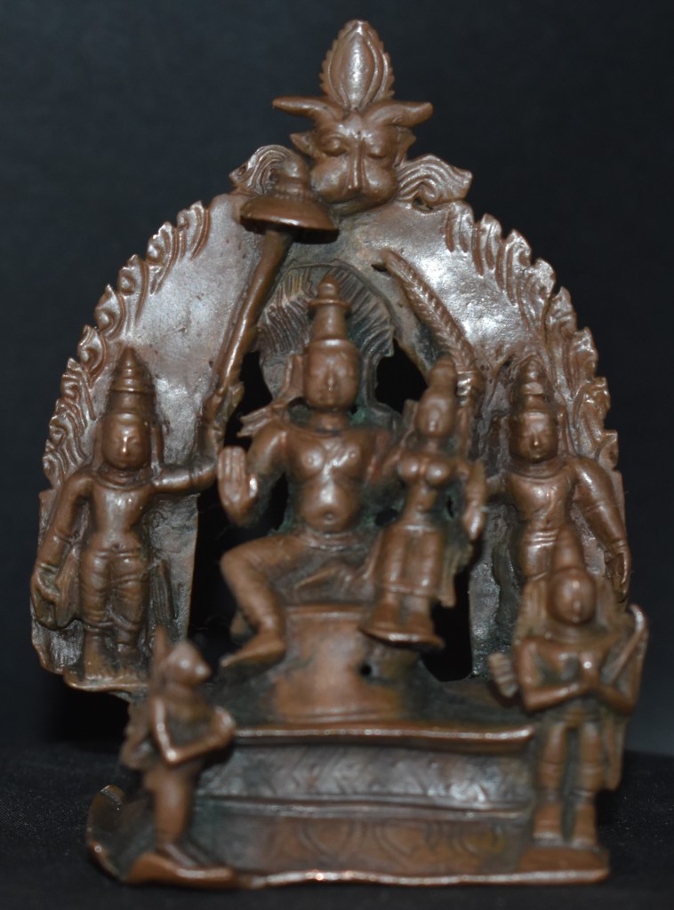 In this case, the iconography is impeccable, and it is a typical Ram Darbar featuring Rama, Sita, Lakshman, Bharatha, Satrughan, and Hanuman. This site has two other examples of Ram Darbar and one is shown below as a comparison. The iconography is complete, consistent, congruent, and appropriate for the age. On that count, it passed the test.