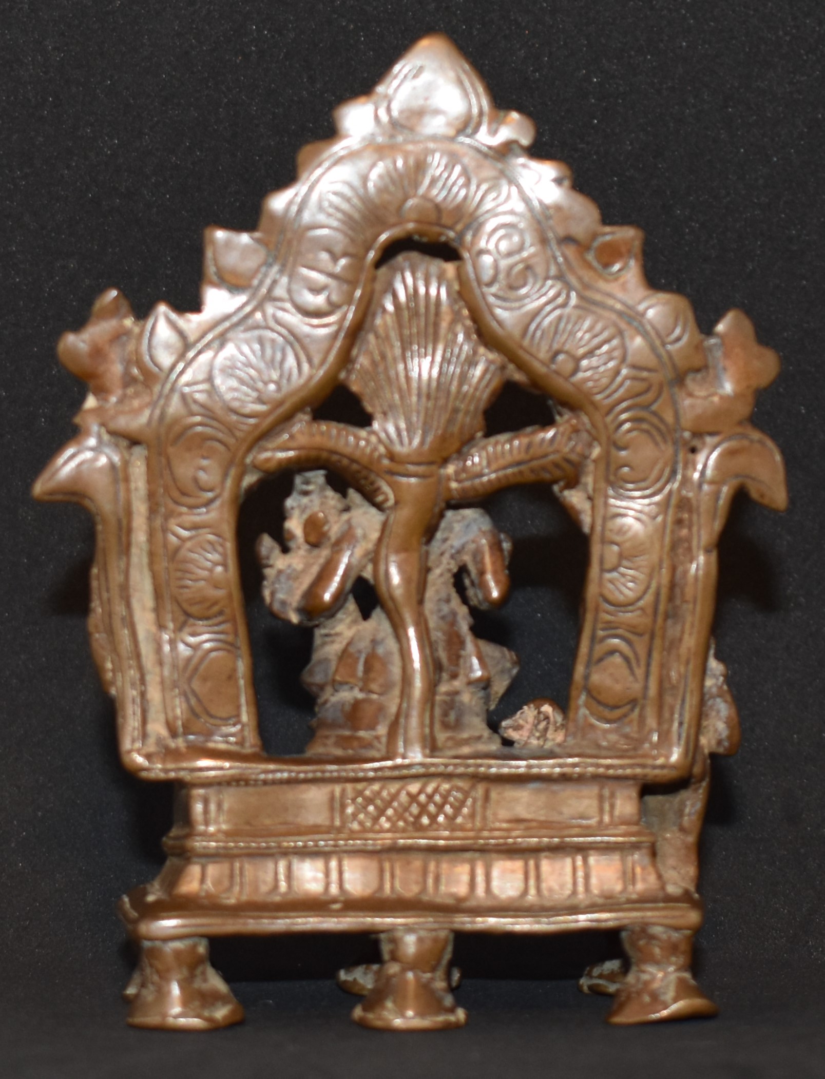 Note Rama’s right hand, and he is displaying Cin mudra. Unusual, considering this is meant to be his Darbar. The Bhadrapeetha, lower platform, is supported by six legs. Unusual construction helps us in assigning this bronze to the Vijayanagara style.