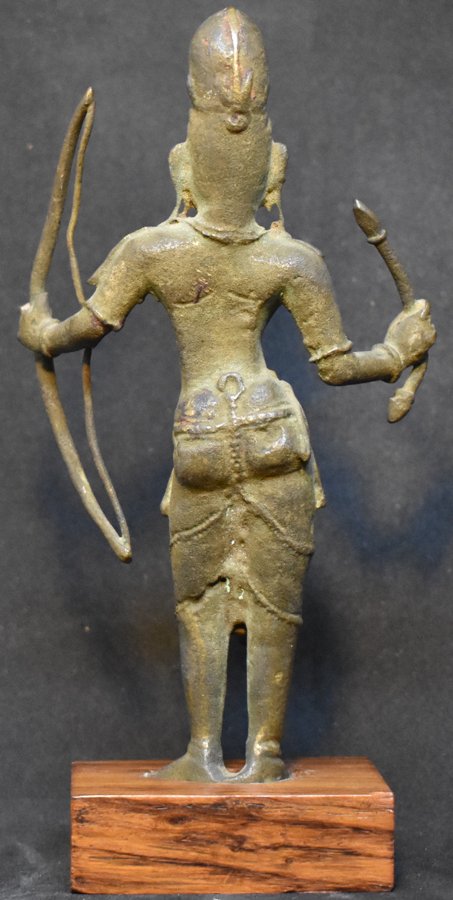 In addition to the bow and arrow, he is also carrying a dagger. See the right view. Yes, I have a classical bronze of Rama with a dagger.