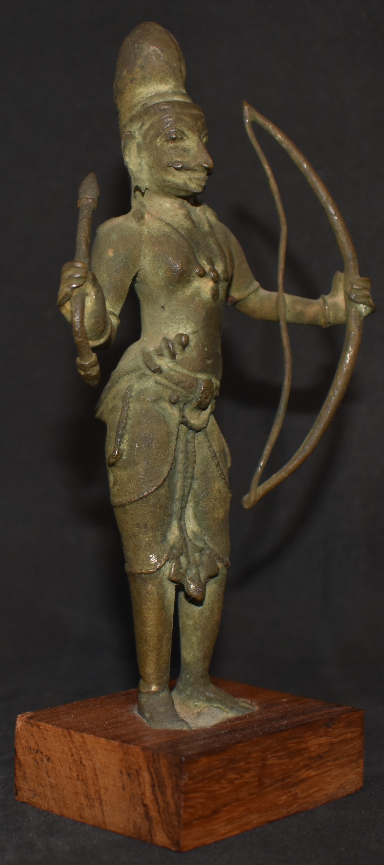 This bronze is tentatively identified as Rama, based on the bow and arrow. Given it is a folk bronze, it may be a depiction of a local chieftain.