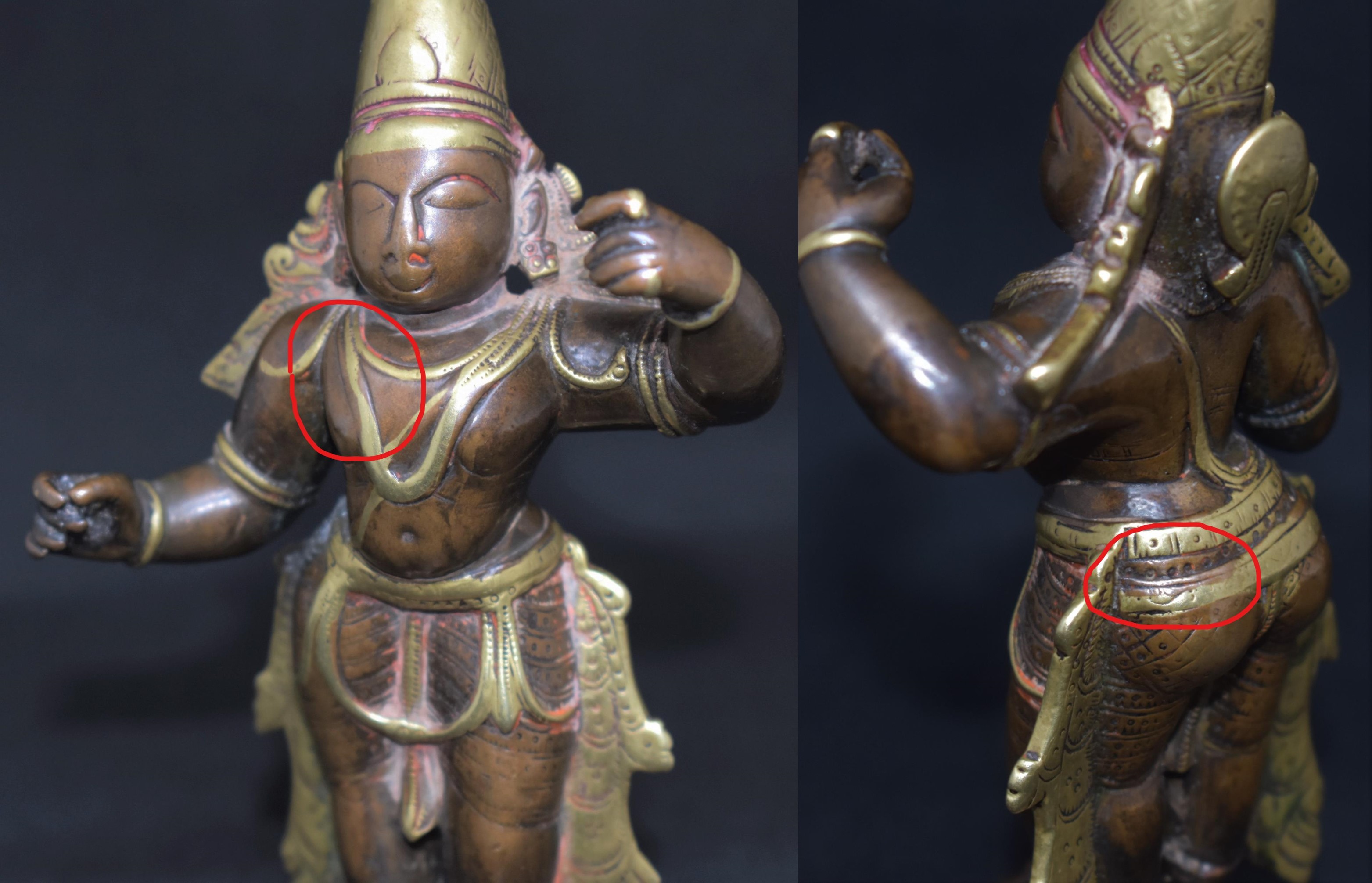 There are at least two techniques used in making this Vigraha. The side tassel of the lower garment is made of solid brass and is inserted into the body along the grooves cut for that purpose. For another example of this technique see Udupi Krishna. The other technique used is to ‘lay’ a very thin brass sheet, almost a foil, on the Vigraha to highlight the ornaments and decoration. In the places of high wear, one can see the copper portion underneath. In the photos below portion of high wear and where underlying copper is showing is highlighted.