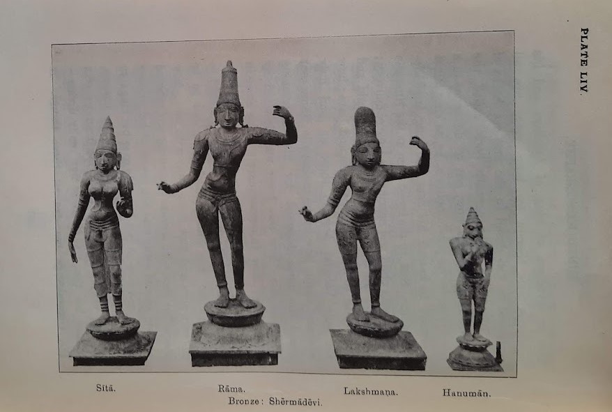 This Vigraha is 12.5 cm in height and it is from Karnataka. The Vigraha may be dated to the eighteenth century. For comparison, I have included an example from Rama Vigraha dating to the 17th century (Nayak period) and now in the Chennai Museum. Reproduced from Manual of the Bronzes in Chennai Museum by Dr. R Kannnan.