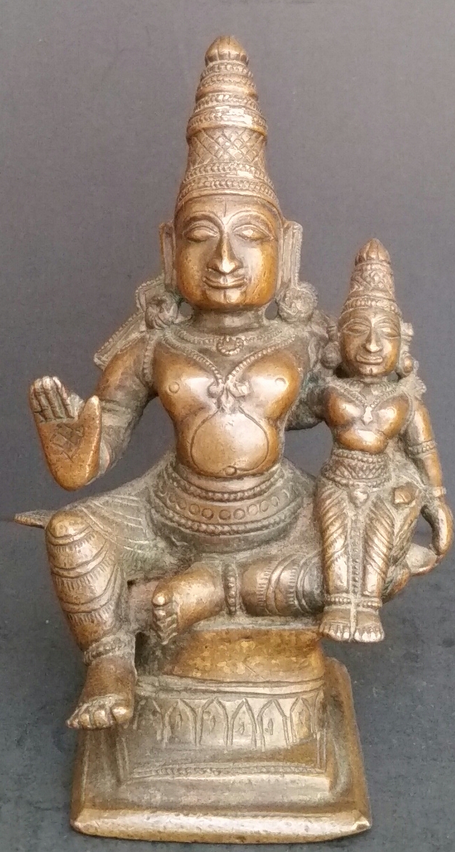 This bronze is Rama with his consort Sita. His right hand is abhaya mudra (protection).