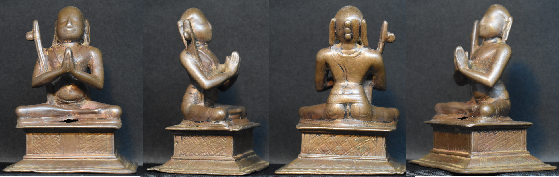 Here Ramanuja Acharya is delightfully depicted in a miniature bronze. The patina is deep and there are obvious signs of worship.