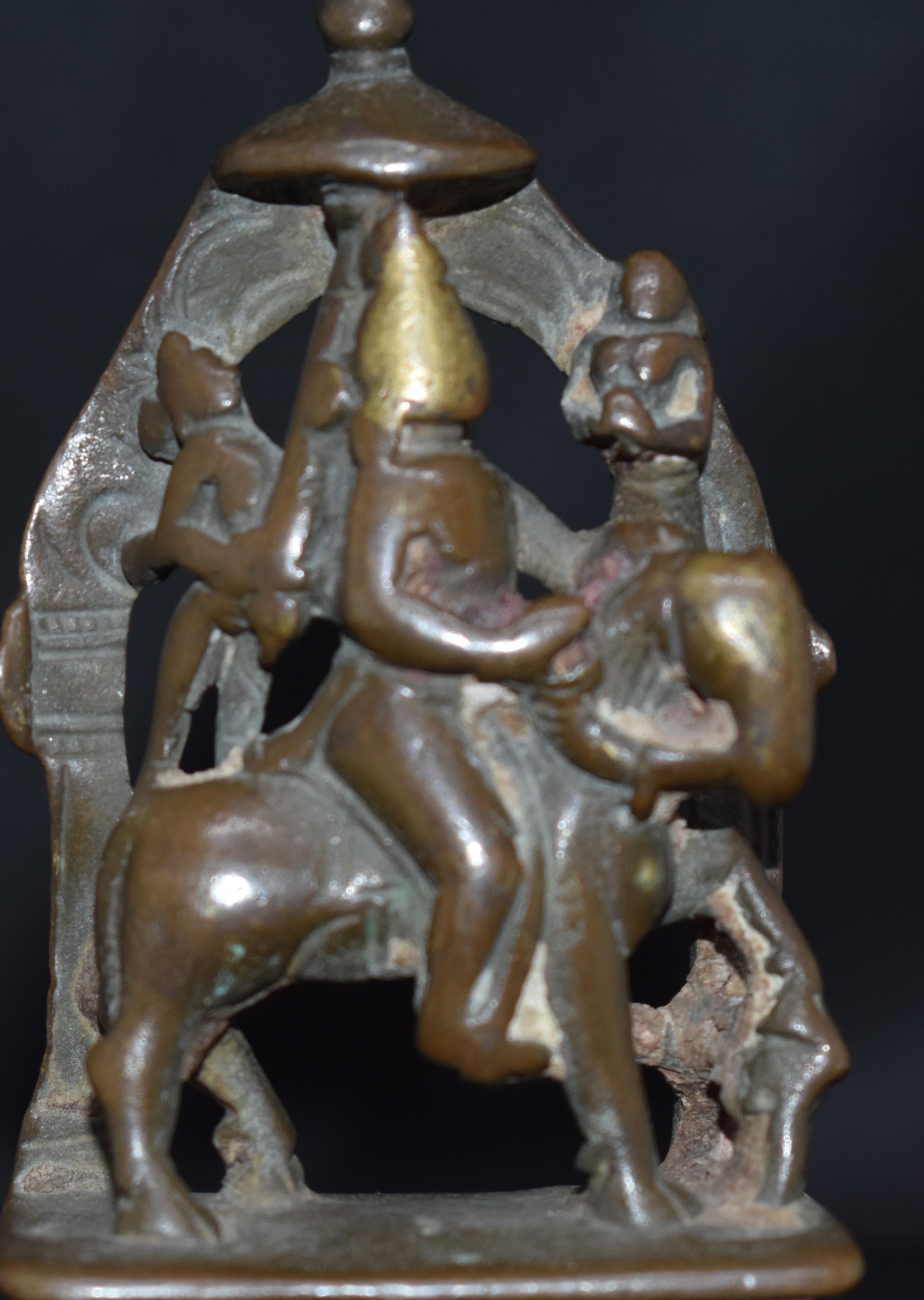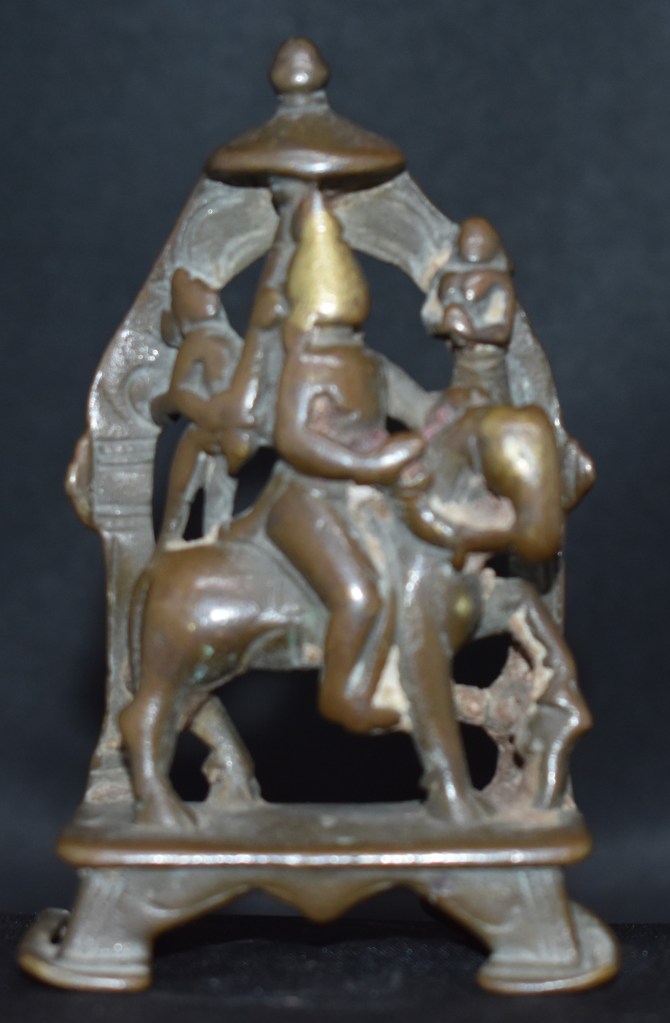 Revanta, in this example, is holding reins with both hands. The horse’s head is turned towards the viewer; the left leg is raised, bent at the knee, the hoof resting on something, possibly a dog. At the back is the parasol carrier and above the horse’s head is a figure in Anjali mudra. In front of the horse, there is, possibly, another attendant.