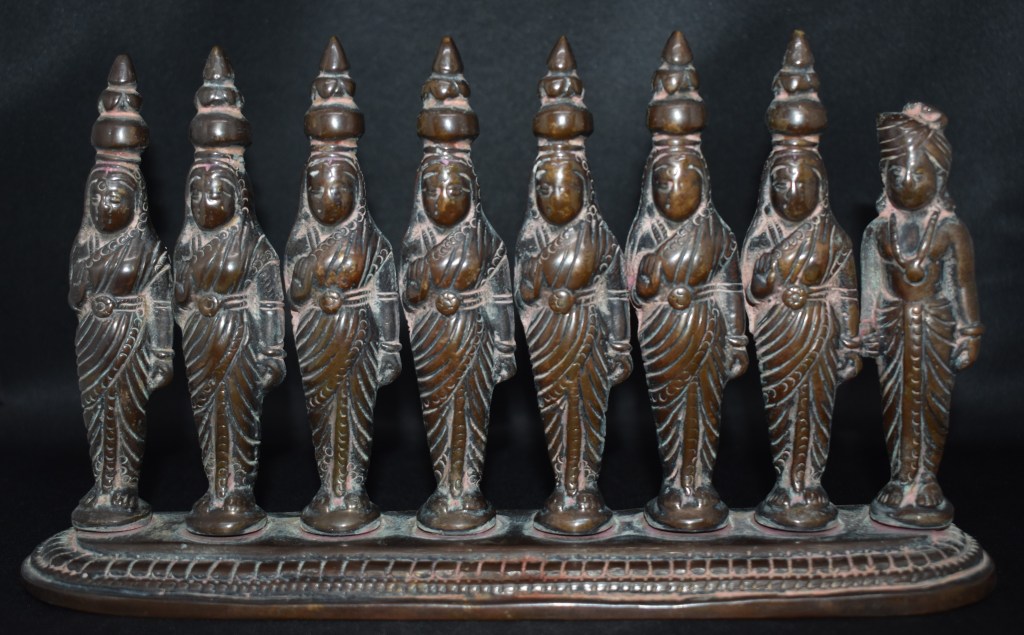 Original blog: This group of seven Goddesses is Saptamatrika (Seven Mothers). The eighth figure is Bhairava. The concept of worshipping a group of goddesses dates back to the Mahabharata period. This concept probably evolved from village goddess cults central to folk and tribal tradition.