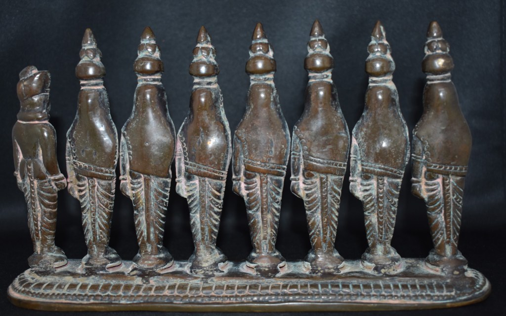 This bronze is from the twentieth century. It is from Central India/Maharashtra. It is about 14.5 cm in height and 24 cm in length. All the pieces are individually cast and attached to the base. The male figure on our right side is likely to represent Bhairava. Sometimes the Matrika’s are shown with Ganesha. This bronze shows signs of worship.
