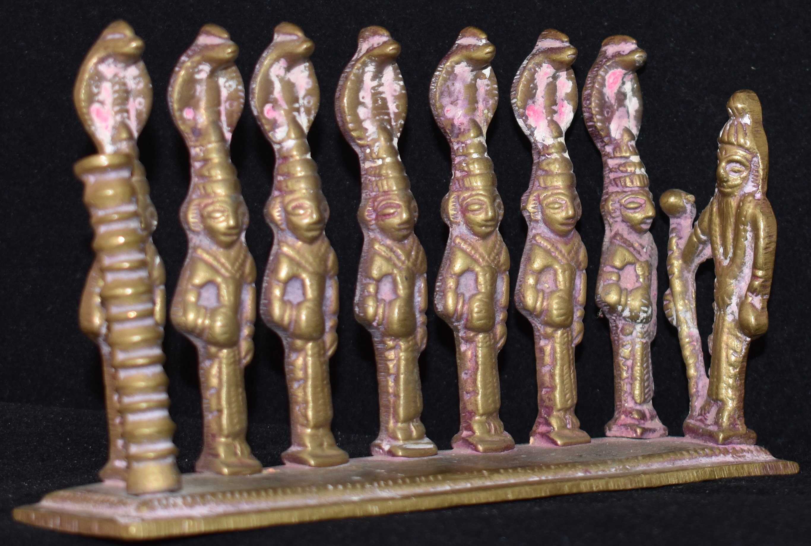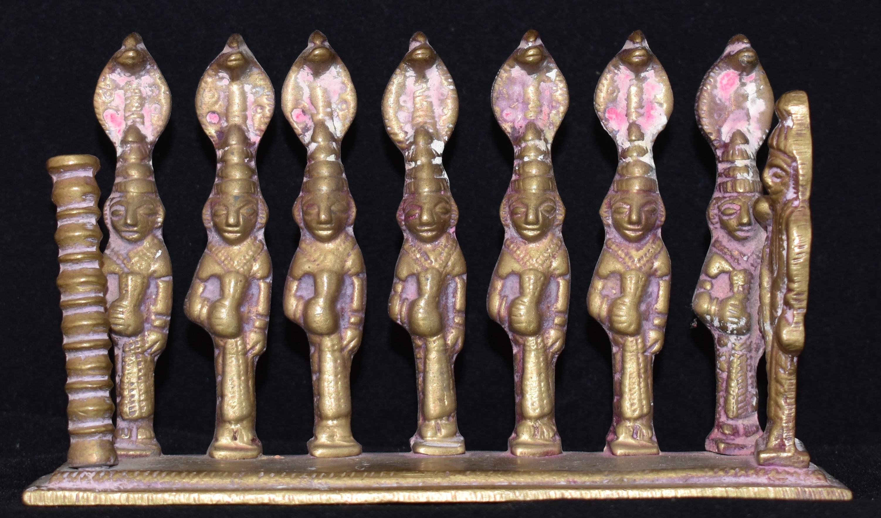 This bronze is modern as in recent production, the twentieth century. It is most likely from Central India/Maharashtra. It is about 8 cm in height and 14 cm in length. All the pieces are moulded and attached to the base. The figure on our right side is likely to represent Bhairava. Sometimes the Matrika’s are shown with Ganesha. The significance or purpose of the pole on our left is not known. This bronze shows signs of worship.